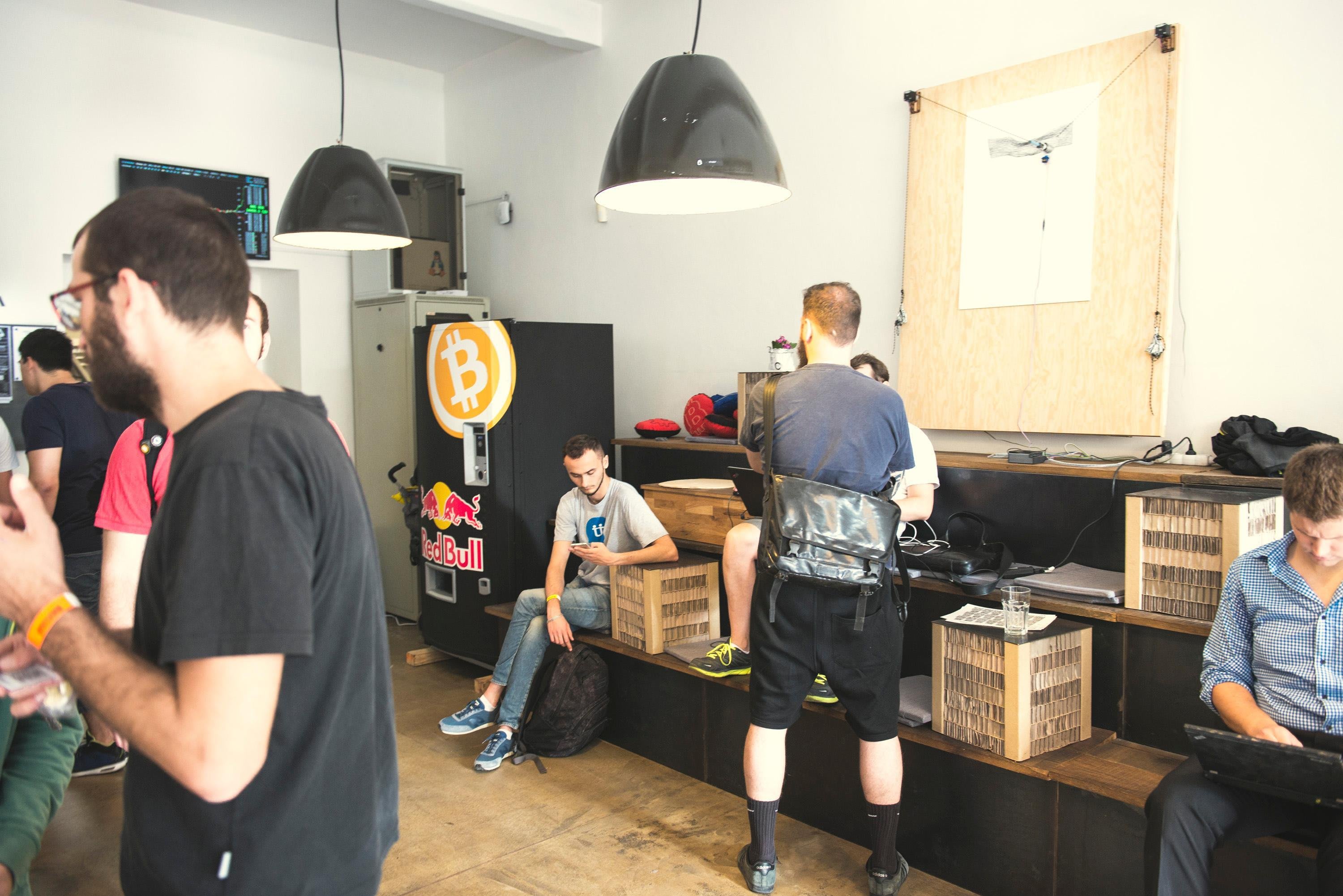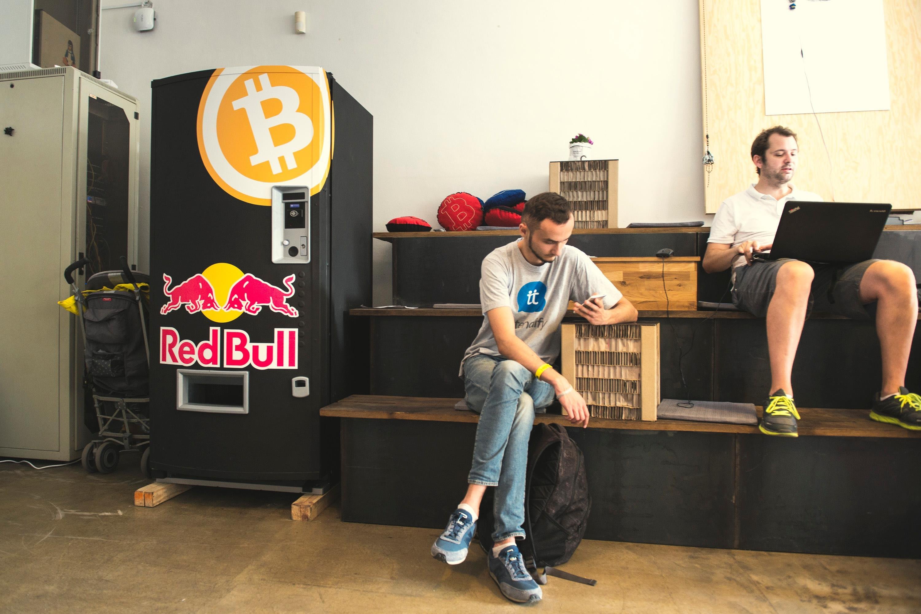 Jednou z vedlejších vychytávek, která návštěvníkům dodá energii, je i první bitcoinový Red Bull automat.