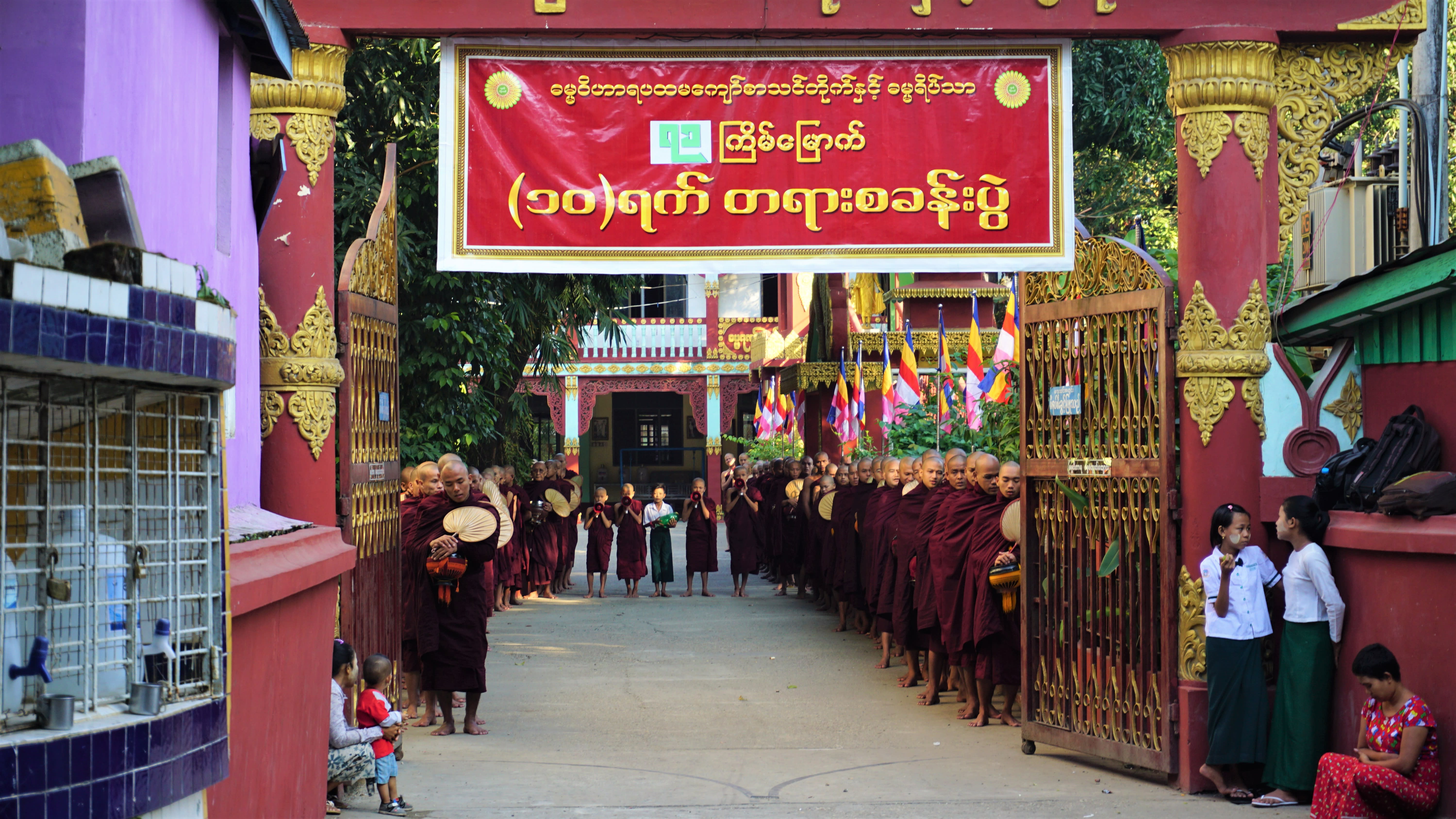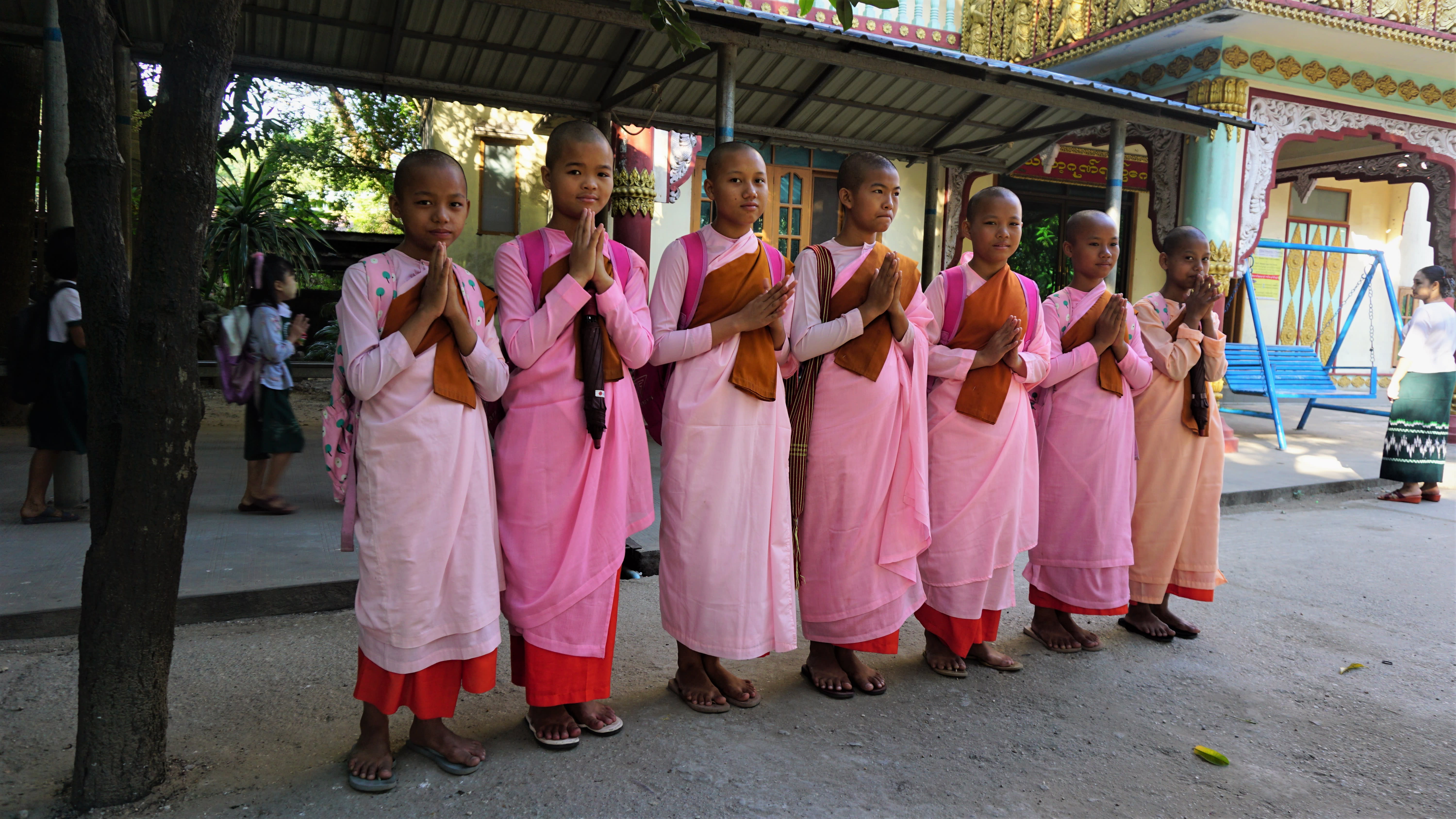 Povinností správného barmského buddhisty je vstoupit na nějaký čas do kláštera a stát se mnichem nebo mniškou. Každý muž se do třiceti let věku musí stát mnichem a vstoupit do kláštera alespoň třikrát. Ženy musí do kláštera vstoupit alespoň jednou do třiceti let věku. Proto všude na ulicích uvidíte mnichy a mnišky, kteří se těší velmi vysoké úctě. Když do kláštera vstupují, dostanou celu, ve které jsou po celou dobu pobytu ubytovaní, mnišská roucha, která jsou každý den vyměňována za čistá a další vybavení.