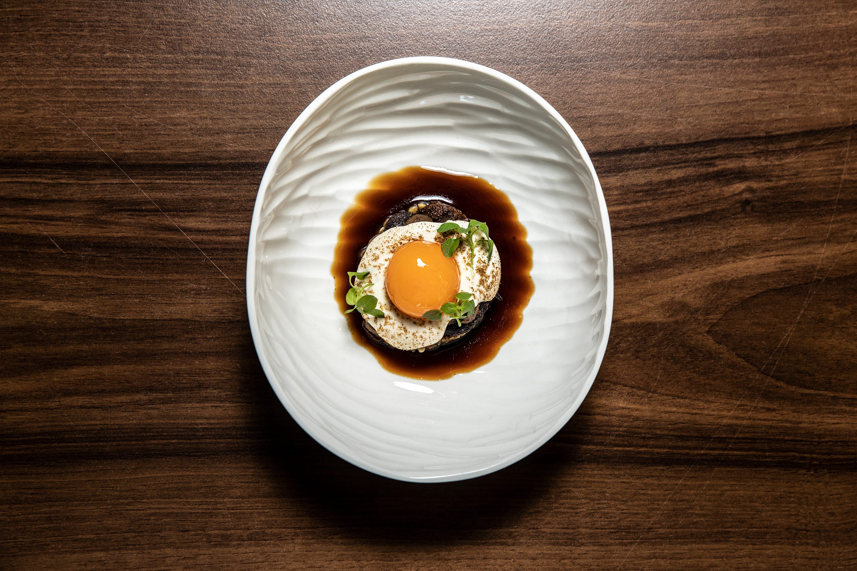 Míchaná vajíčka s lanýžem, sušené a strouhané jehněčí srdce, zmrzlina z hnědého masa.