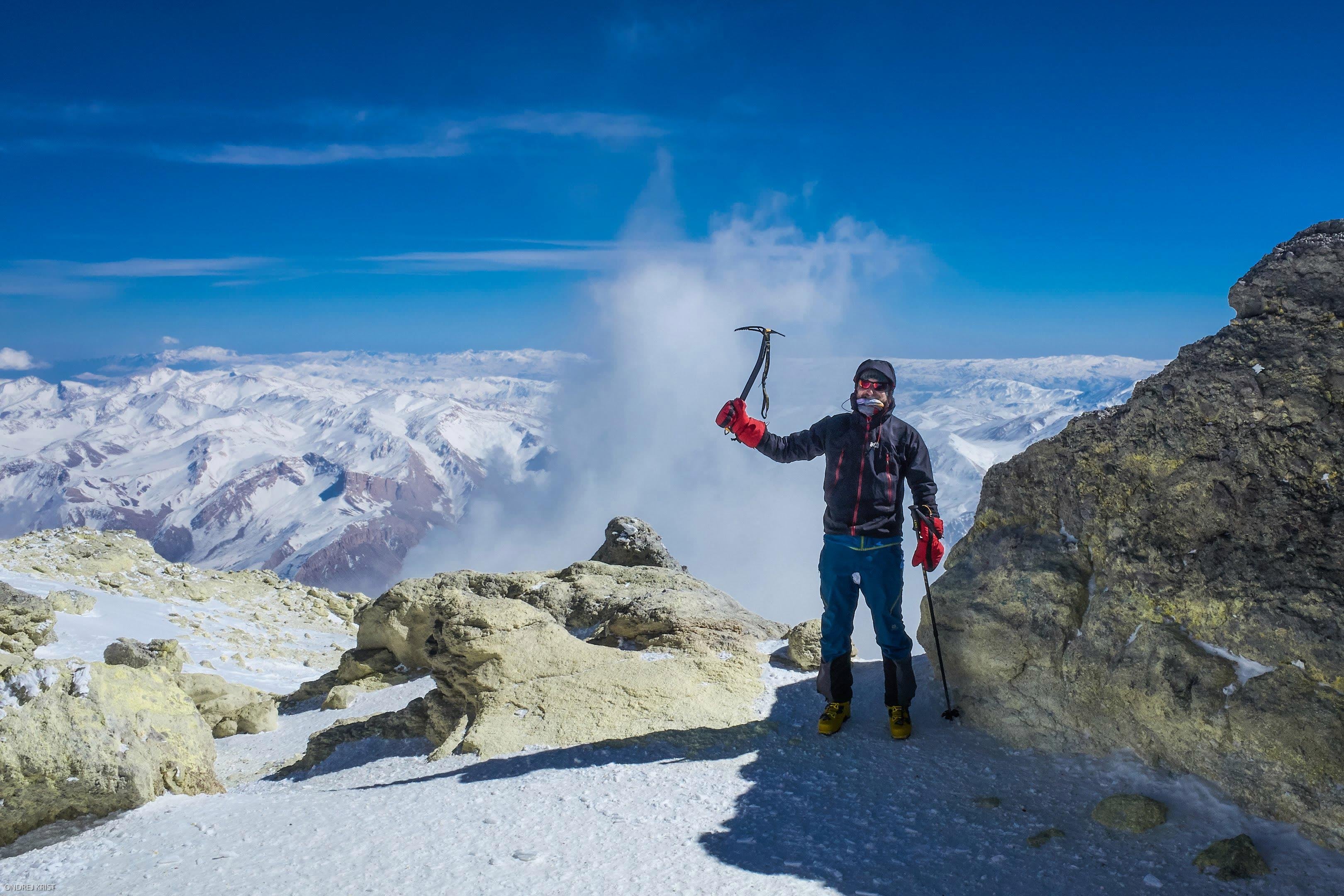 Nabalili jsme se do všeho, do čeho jsme se nabalit mohli a vyrazili k vrcholu. Výstup nám zabral něco přes šest hodin, zdržel nás hlavně ubývající kyslík. Posledních 200 výškových metrů se jde na botách. Z vrcholu se jako ze správné sopky kouří a všechno smrdí sírou. Cesta dolů není úplně “šmak jazda v prašaně”, ale 3 500 výškových metrů po tvrdém sněhu. Když vyjde počasí (teplota na vrcholu kolem -30) a jsi správně aklimatizovaný, tak Damavand není úplně nejtěžší kopec. Na druhou stranu v den, kdy jsme byli na vrcholu, nikdo jiný nevyvrcholil, a to se o výstup snažilo na 10 lidí. U expedice po nás navíc našli kluci v botách i nějaké ty černé prsty.
