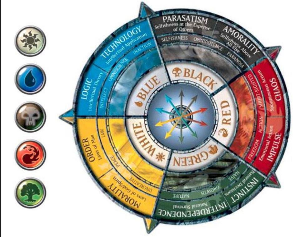 Die Welt von Magic gliedert sich in die Lehre der fünf Farben, die in etwa der mittelalterlichen Vorstellung der Vier-Elemente-Lehre entspricht. Die fünf Farben von Magic entsprechen jeweils bestimmten moralischen Werten und Spieltaktiken: