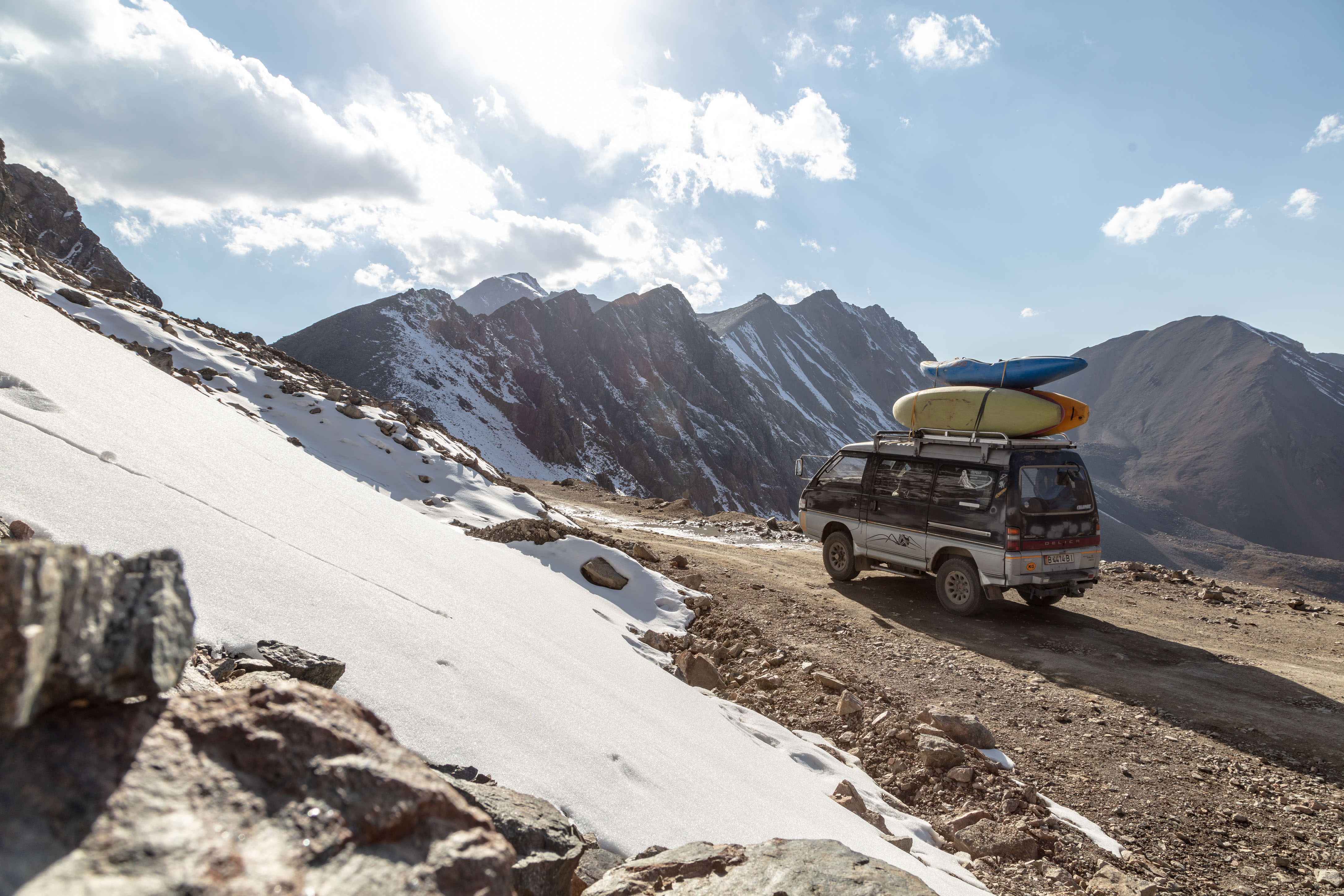 Die erste Herausforderung bestand darin, überhaupt erst zum Fluss zu kommen. Mit einem Kajak zu reisen, stellt sich immer wieder als echte Schwierigkeit heraus - oft verbunden mit Lügen, die den Mitarbeitern der Airlines aufgetischt werden, und erfundene Geschichten darüber, was sich in den Taschen befindet, immer mit der simplen Hoffnung, dass du es irgendwie ins Flugzeug schaffst. Wenn das Boot mit dir an der geplanten Location ankommt, ist das in der Regel das Ende deiner Probleme - nicht aber in einem Land wie Kirgisistan.