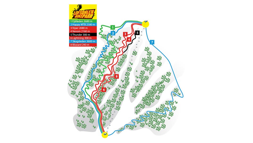 Der Lofsdalen Bikepark ist im mittleren Westen Schwedens situiert. Er hat vor allem für Anfänger eine Menge zu bieten. Auch hier sind die Trails von der berühmten kanadischen Firma Gravity Logic gebaut, sie reichen in ihrem Schwierigkeitsgrad von grün bis schwarz. Direkt nach dem Ausstieg aus dem Lift genießt du zunächst die fabelhafte Aussicht in vollen Zügen, bevor du dich an die langen MTB-Abfahrten machst.