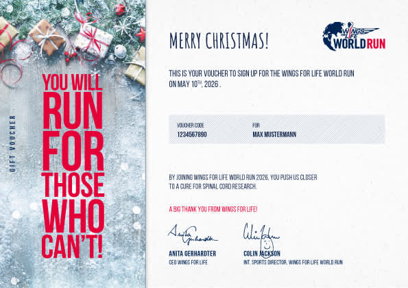Der Gutschein umfasst die Teilnahme am Wings for Life World Run, dem größten Laufevent der Welt und unterstützt gleichzeitig die Mission der Heilung von Querschnittslähmung.