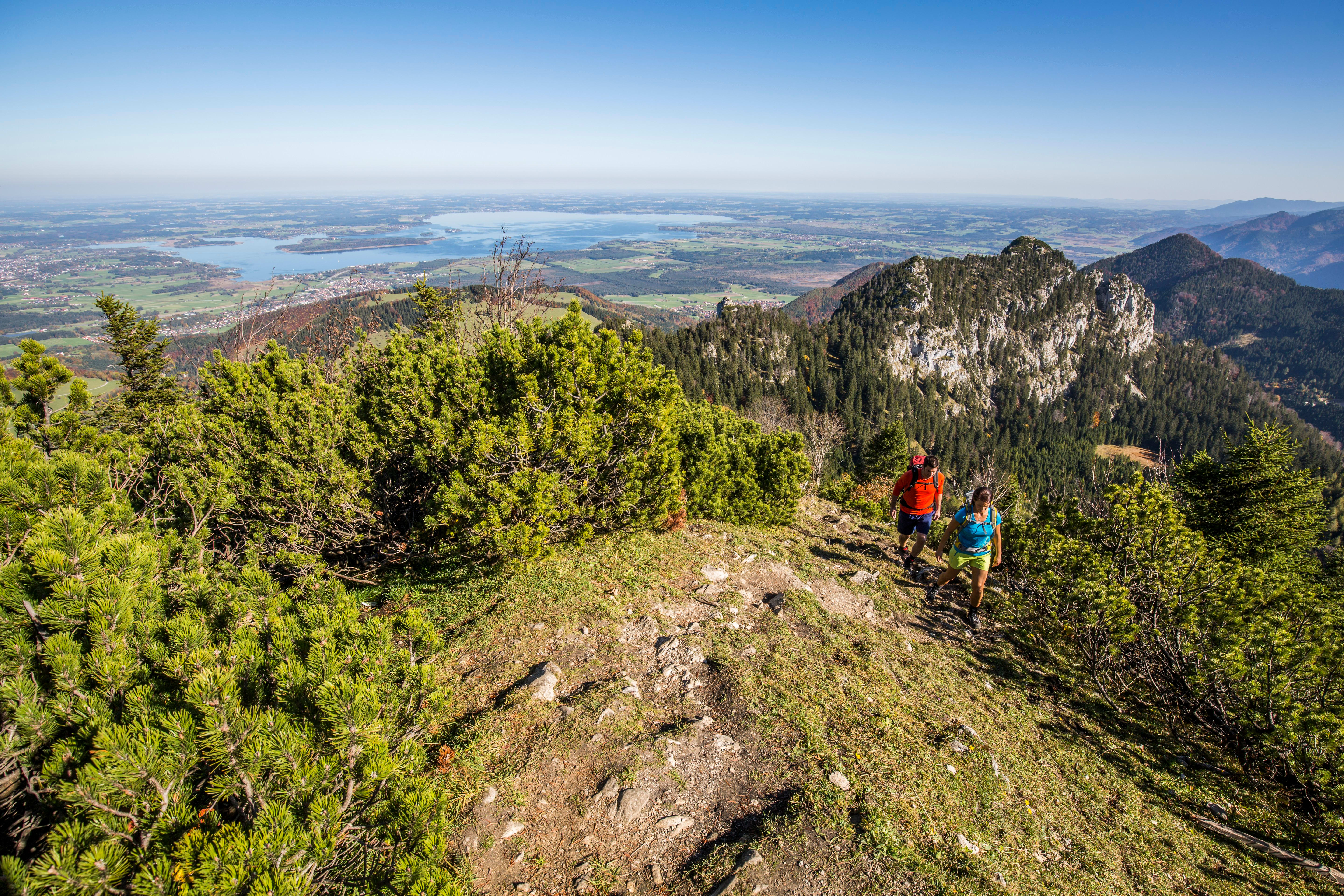 - Strecke: Der Trail startet sportlich mit einem 1.000 Höhenmeter-Anstieg auf den 1.771 Meter hohen Hochstaufen. Belohnt wird der steile Anstieg mit einem super Blick wahlweise ins Berchtesgadener Land oder auf den Chiemsee. Von hier geht es rund 2 km über einen kleinen Steig auf den Zwiesel. Von hier aus folgt man den Wegweisern zur Höllenbachalm und zurück zum Startpunkt.