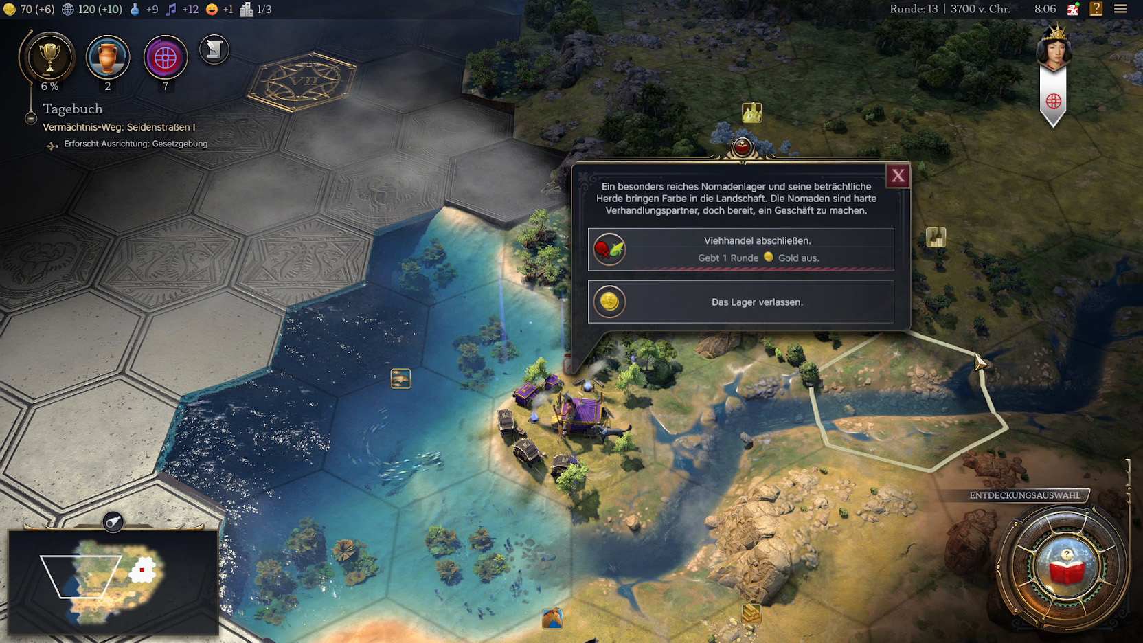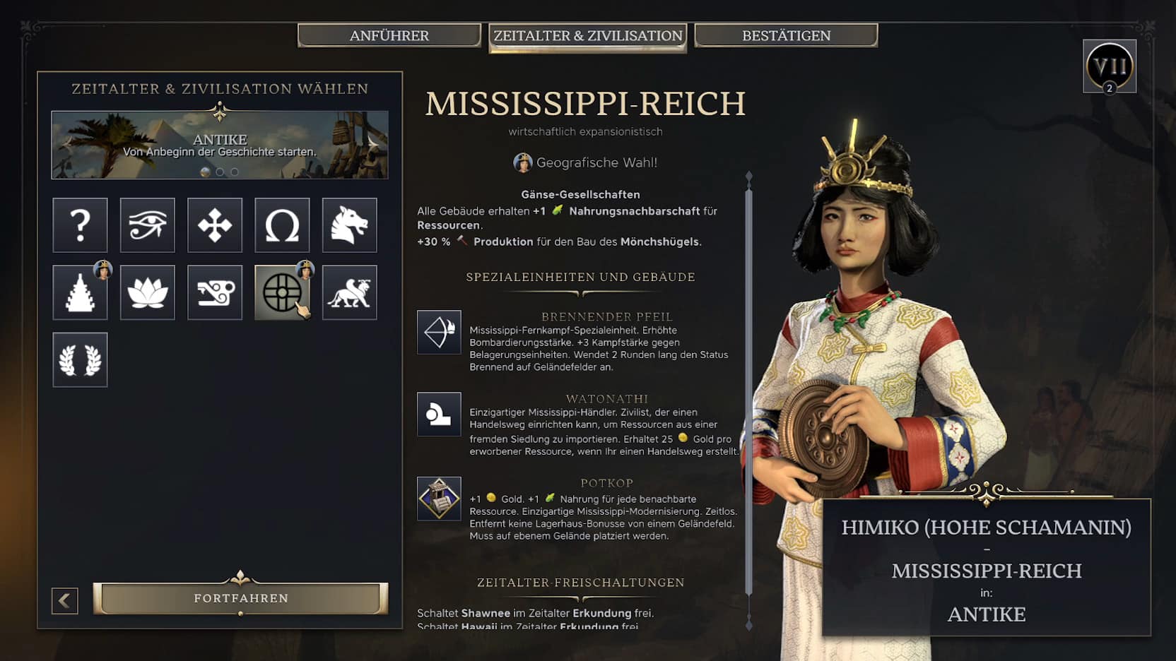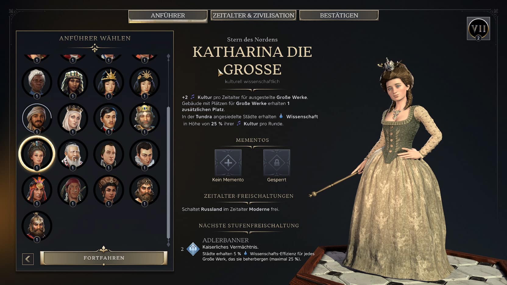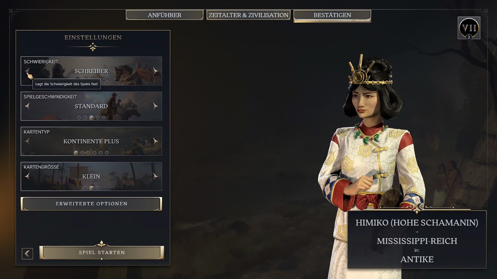 Dasselbe gilt auch für die Wahl der Zivilisation. Anführer sind nicht an eine historisch korrekte Zivilisation gebunden, aber das Spiel empfiehlt hier zumindest passende Kombinationen.