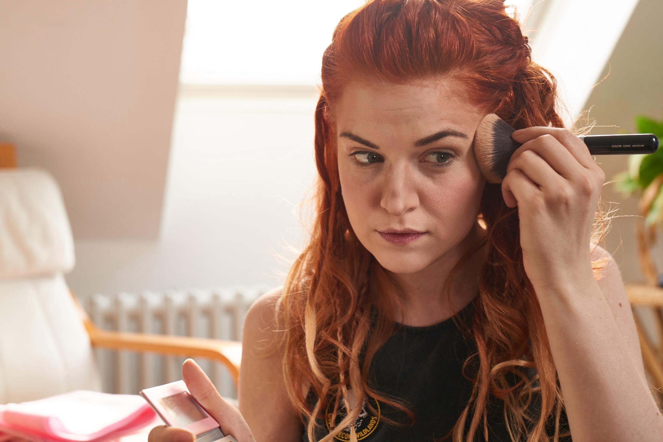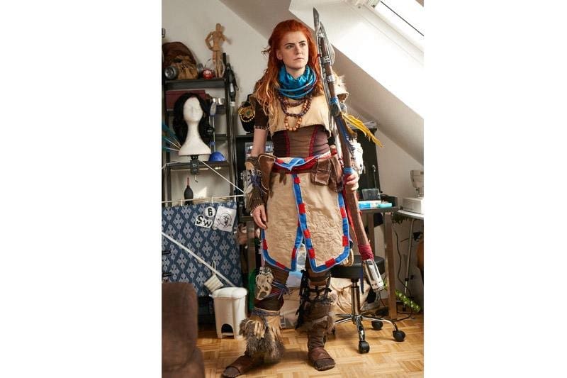 Um alles realistischer wirken zu lassen, schaue ich natürlich auf das Makeup von dem Charakter. Ich sage mir z.B. Aloy hat keine Kunstwimpern, Wimperntusche oder Lipgloss drauf. Das würde einfach nicht authentisch wirken. Auch Nähte werden nicht perfekt genäht und Reparaturversuche werden in das Kostüm gesetzt um es einfach echter wirken zu lassen.