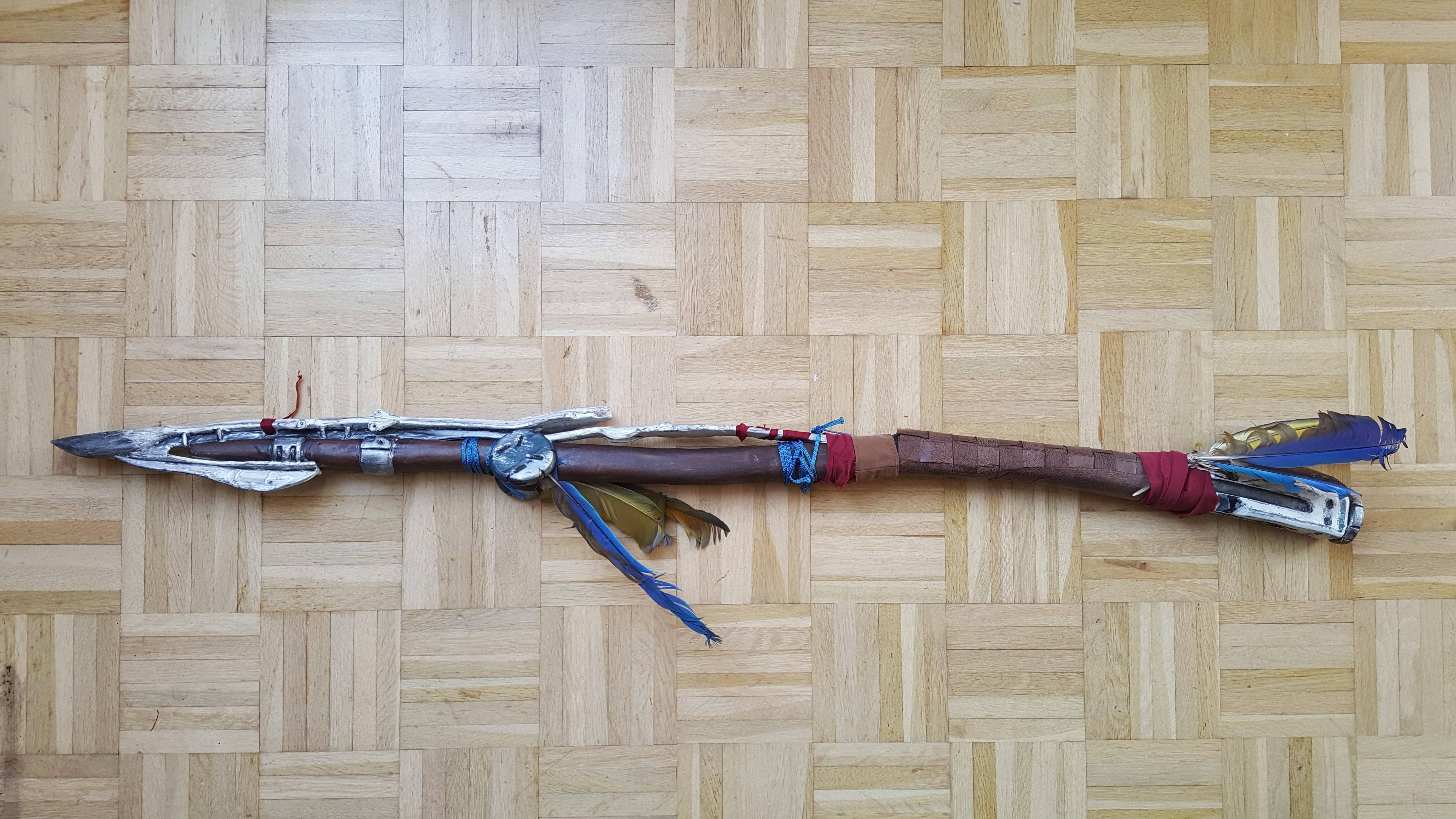 Proportionen sind sehr wichtig! Deswegen mach ich nach jedem genähten oder gebauten Teil eine Anprobe um die Teile aufeinander abzustimmen. Habe ich zum Beispiel Rüstüngsparts wie bei Aloy an Armen und Beinen, mache ich es mir ganz einfach; Ich ziehe mir ein Bild auf den Fernseher, nehme Arme und Beine als Größenvorgabe und pause danach einfach mit Seidenpapier das Teil in der richtigen Skalierung ab. So stimmen auf jeden Fall die Proportionen. Dasselbe haben wir auch bei dem Speer gemacht!