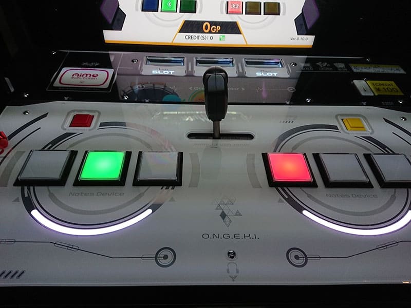 Auf den ersten Blick weiß man ersten Blick gar nicht wo man bei O.N.G.E.K.I seine Hände hinpacken soll. Das Cab bietet zwei Sets aus drei Buttons, dazwischen einen Kipphebel und zwei große Push-Buttons an den Wänden der Kabine. Bei diesem Rhythmus-Game steuert ihr ein Team aus drei Magical Girls im Kampf gegen ihre Kontrahenten. Dabei müssen Noten mit den unterschiedlichen Knöpfen getroffen und Hindernissen mit dem Hebel ausgewichen werden. Seid ihr erfolgreich, könnt ihr neue Charaktere freischalten und euch diese auch als Sammelkarte ausdrucken.