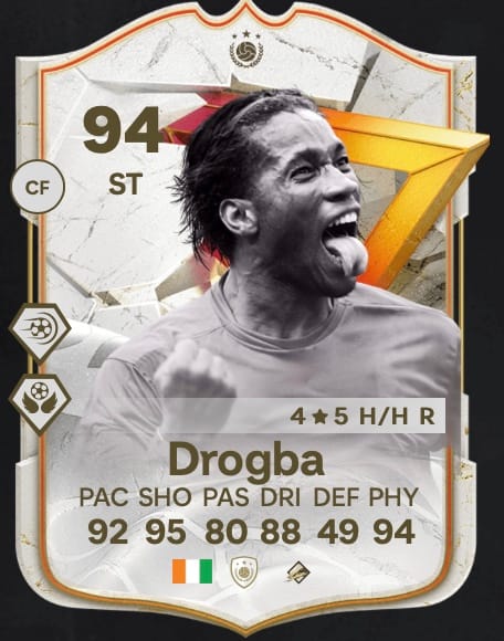 Bleiben wir bei der aktuellen Meta von FC 24, in der vor allem das Flankenspiel dominant ist, habt ihr mit kopfballstarken Stürmern einen entscheidenden Vorteil. Wenn sie zusätzlich über Top-Werte bei der Physis verfügen, sind sie noch schwerer zu verteidigen. Ein Beispiel für einen kompletten Angreifer in FC 24 ist die Golazo Icon-Karte von Didier Drogba.