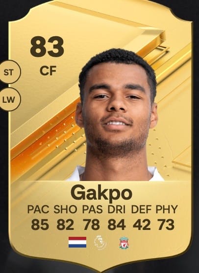 Der nächste Niederländer. Auch Cody Gakpo hat es uns in FC 24 Ultimate Team angetan. Bei 85 Tempo, 84 Dribbling und 82 Schuss auch kein Wunder, oder? Der Stürmer von Klopp-Klub FC Liverpool ist ein echtes Schnäppchen und ist beispielsweise kongenialer Sturmpartner von Landsmann Arnaut Danjuma.