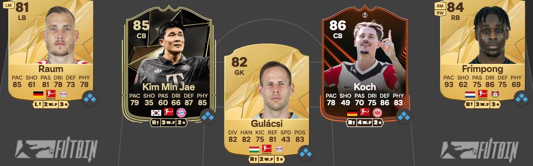 Vor Gulácsi in der Viererkette spielen in der Zentrale Robin Koch von Eintracht Frankfurt und Min-jae Kim vom FC Bayern München. Beide standen bereits im Team of the Week und haben von EA eine Inform-Karte erhalten. Der deutsche Nationalspieler und EM-Teilnehmer Koch begeistert mit Ratings wie 86 Verteidigen und 83 Physis. Bayerns Min-jae Kim ebenfalls - 87 Verteidigen und 85 Physis sind Top-Werte. Links in der Abwehr spielt David Raum von den Roten Bullen. Der deutsche Nationalspieler ist schnell (85 Tempo) und hat einen starken Physiswert (78). Die Verteidigung komplettiert Jeremie Frimpong vom deutschen Meister Bayer 04 Leverkusen. 93 Pace und 86 Dribbling machen den Niederländer zu einem großartigen Rechtsverteidiger für dein Bundesliga Starter Team in FC 25 Ultimate Team.