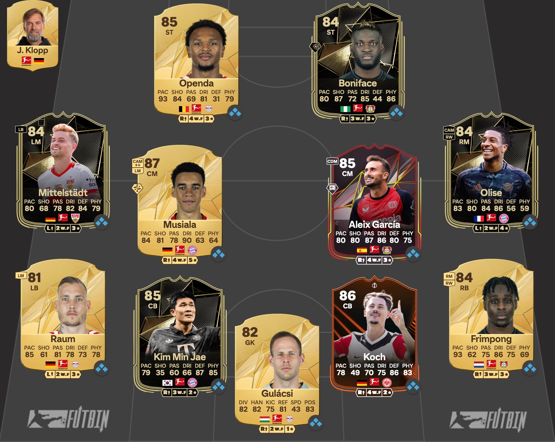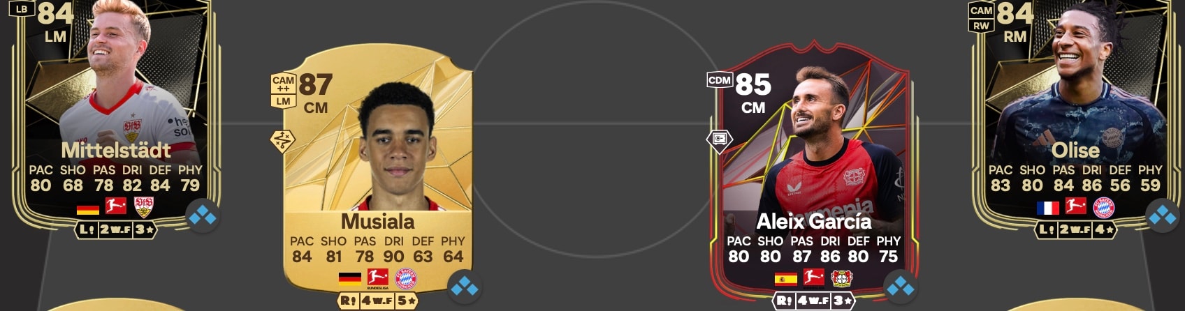 Das Mittelfeld wird angeführt von Jamal Musiala. Der Dribbelkünstler des FC Bayern München ist der Spieler mit dem höchsten Gesamtrating in unserem FC 25 Bundesliga Starter Team. Mit Werten wie 90 Dribbling und 84 Tempo wird dir der Star der DFB-Elf große Freude bereiten. Neben Musiala setzen wir in der Mittelfeldzentrale auf die Inform-Version von Aleix Garcia. Der spanische Neuzugang von Bayer 04 Leverkusen ist ein klassischer Allrounder - mit fast ausschließlich Werten von 80 aufwärts.