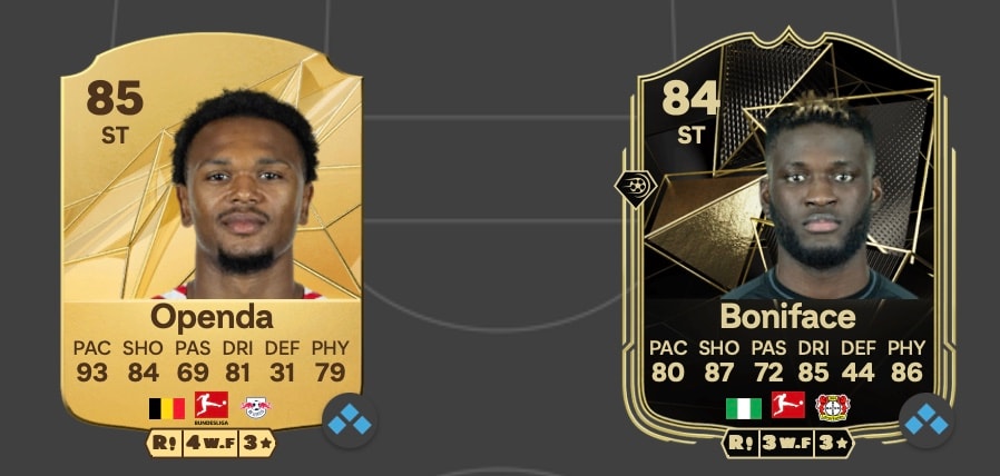 Der Sturm wird von einem RB Leipzig-Star angeführt. Loïs Openda, der in FC 25 ein Upgrade von +3 erhalten hat, überzeugt mit 93 Pace und 84 Schießen. Der Belgier ist ein Riesengewinn für deine Offensive! Neben Openda stürmt Victor Boniface von Bayer 04 Leverkusen. Der Nigerianer ist der sechste Spieler in unserem FC 25 Bundesliga Starter Team mit einer Inform-Karte. Mit 87 Schießen und 86 Physis ist Boniface die perfekte Ergänzung zum pfeilschnellen Openda.