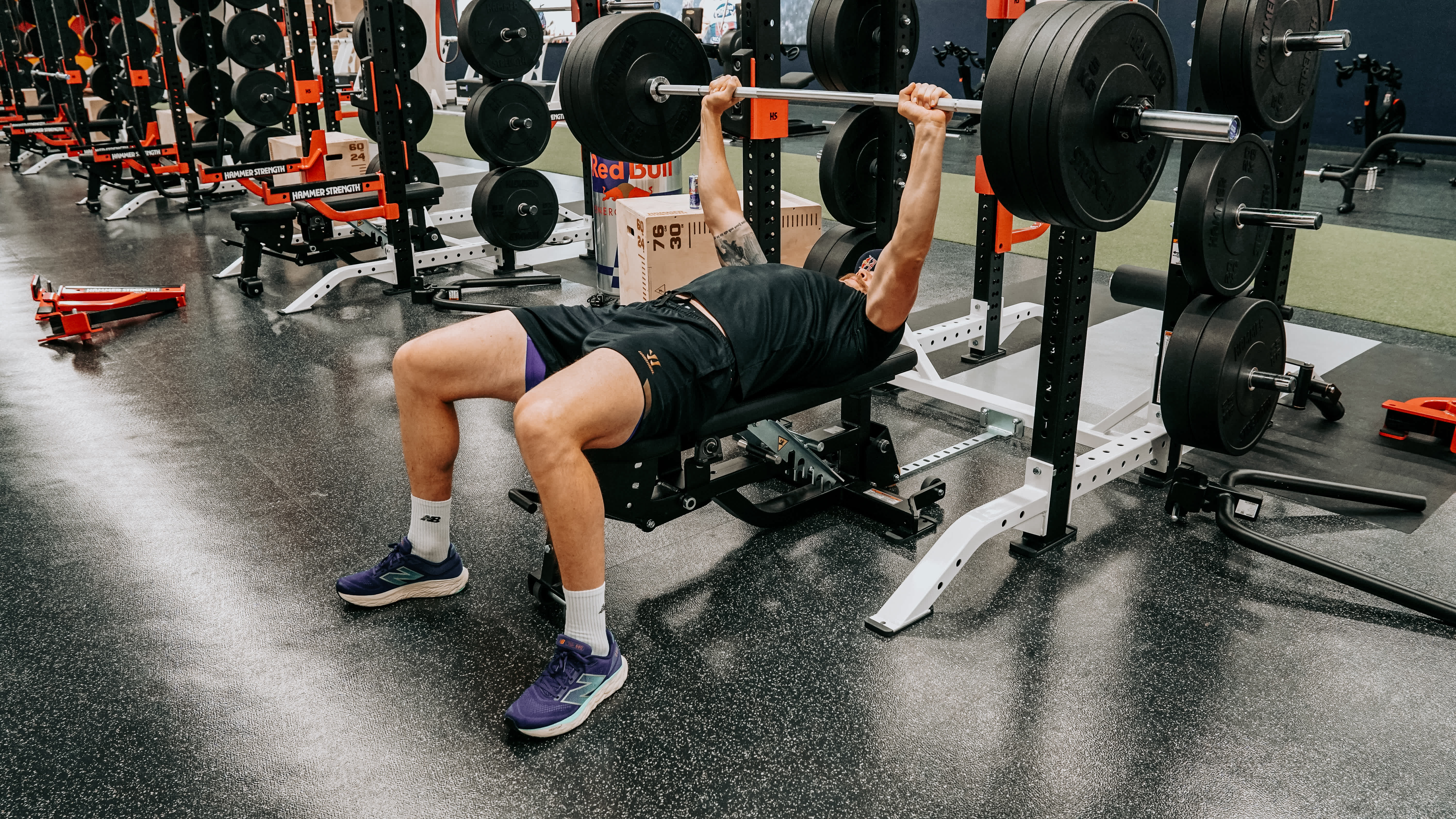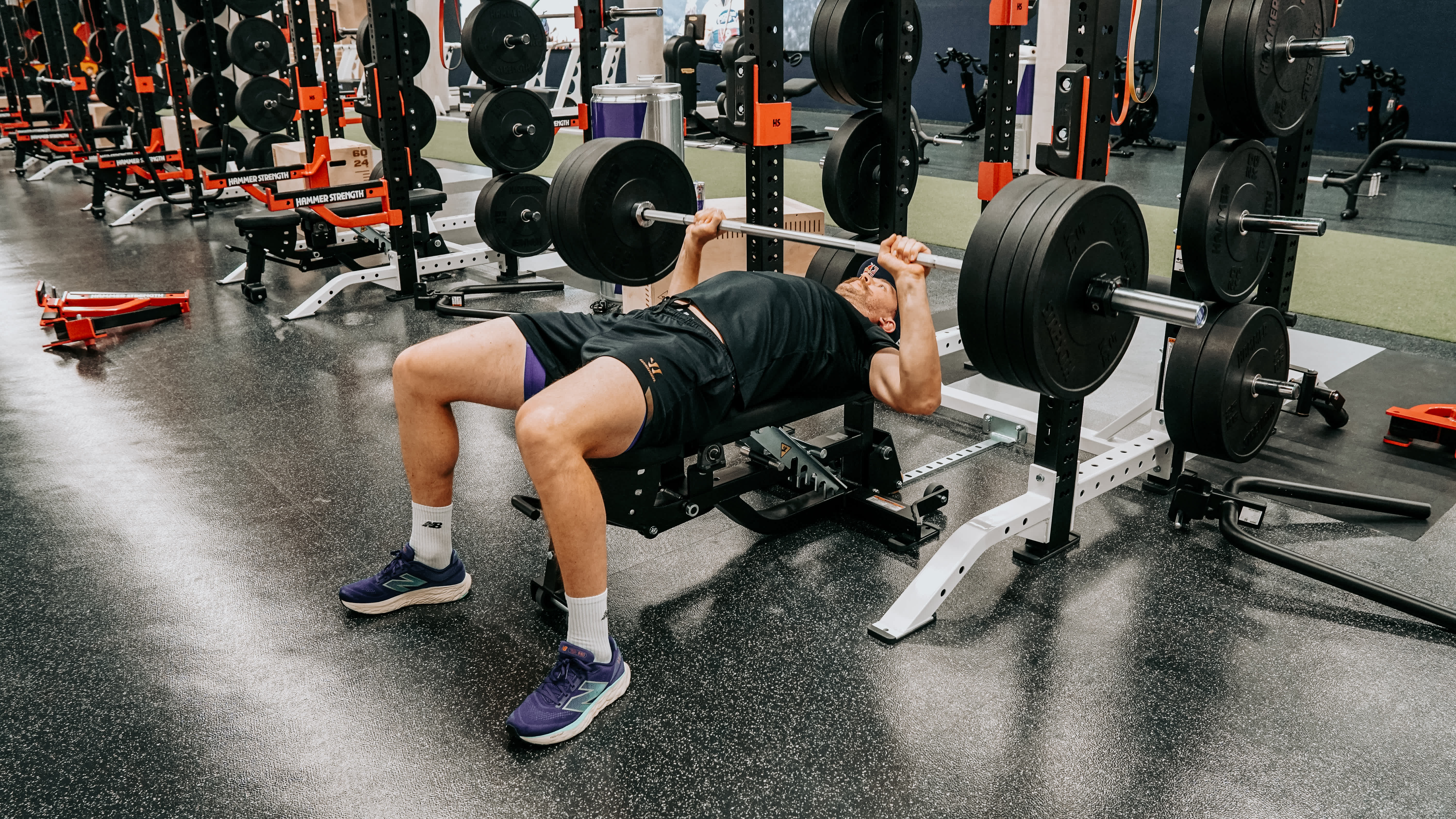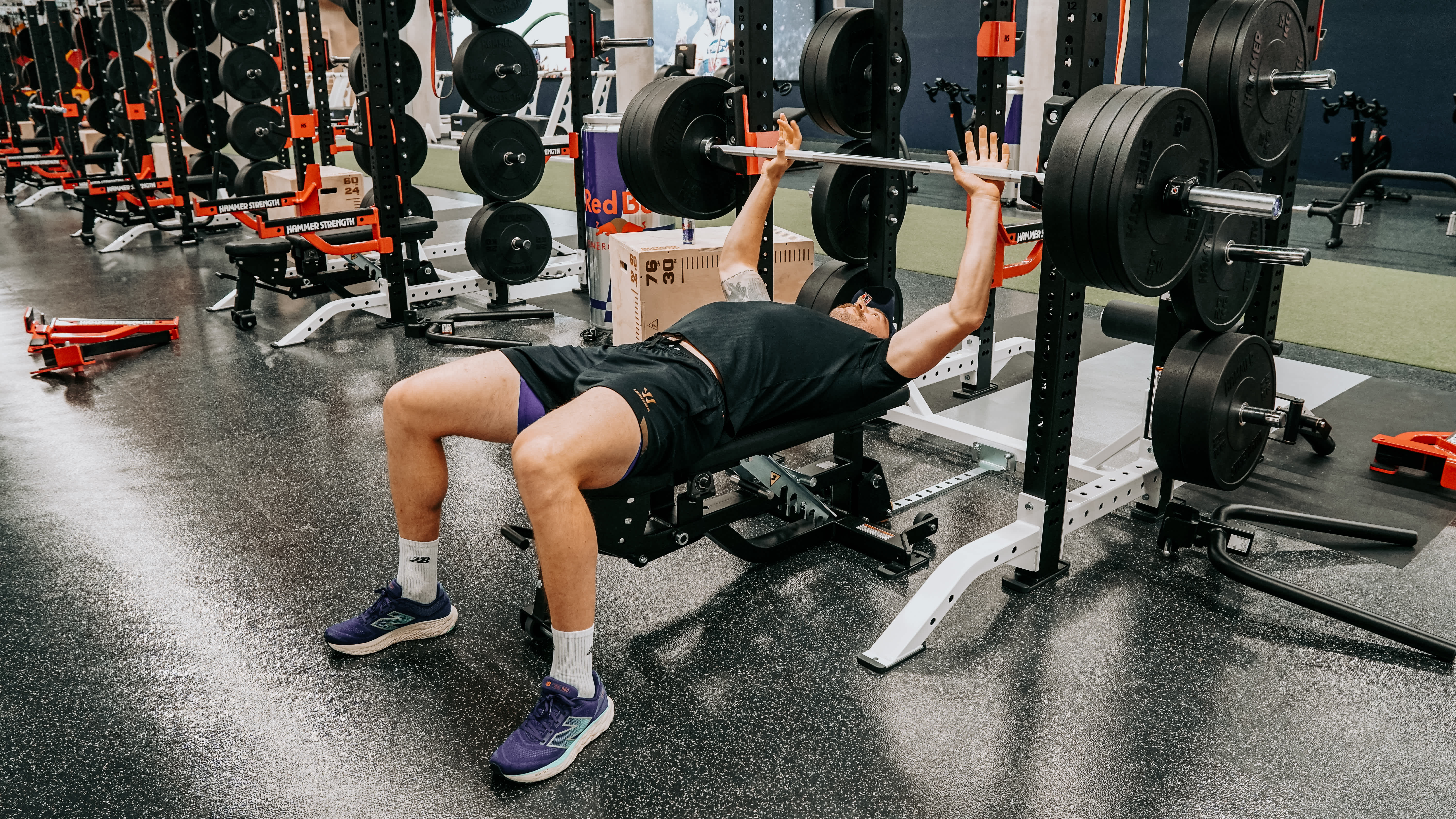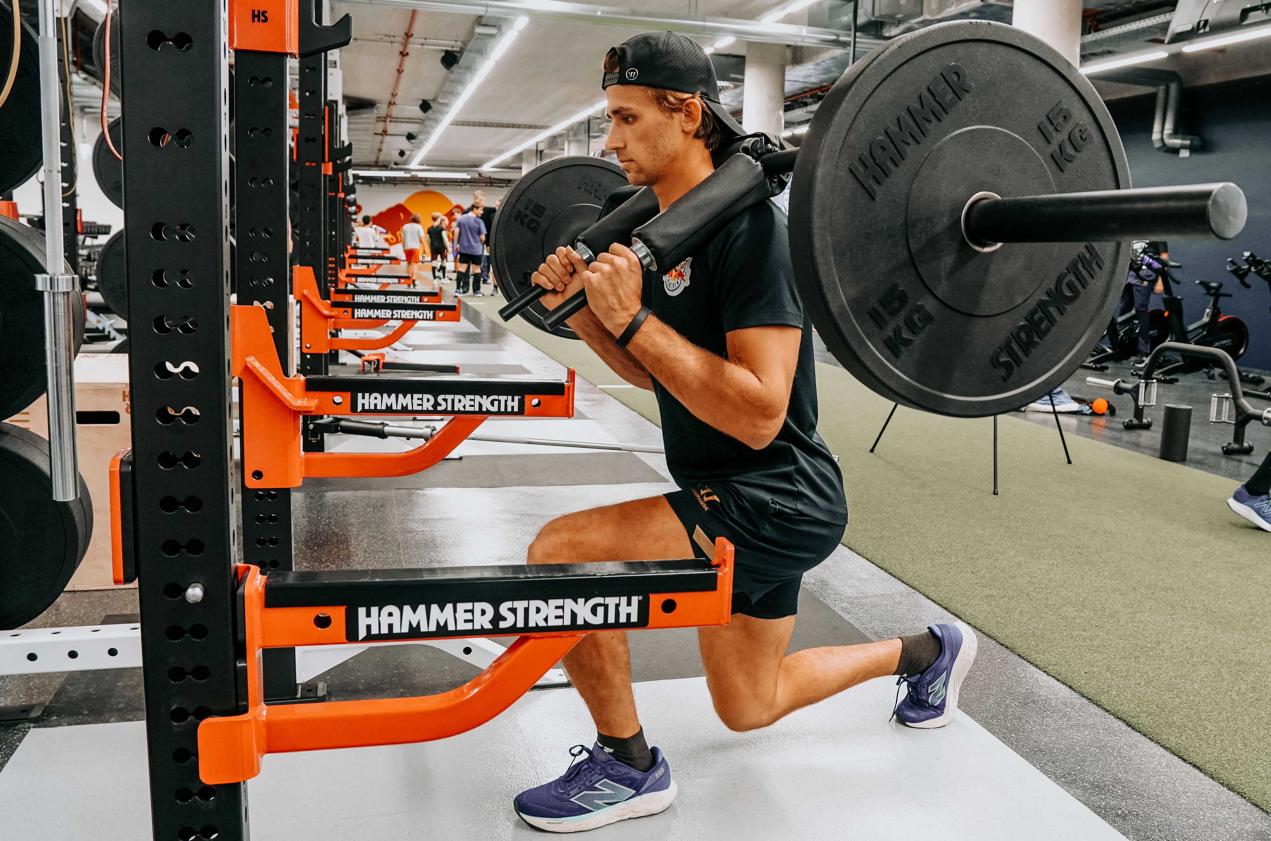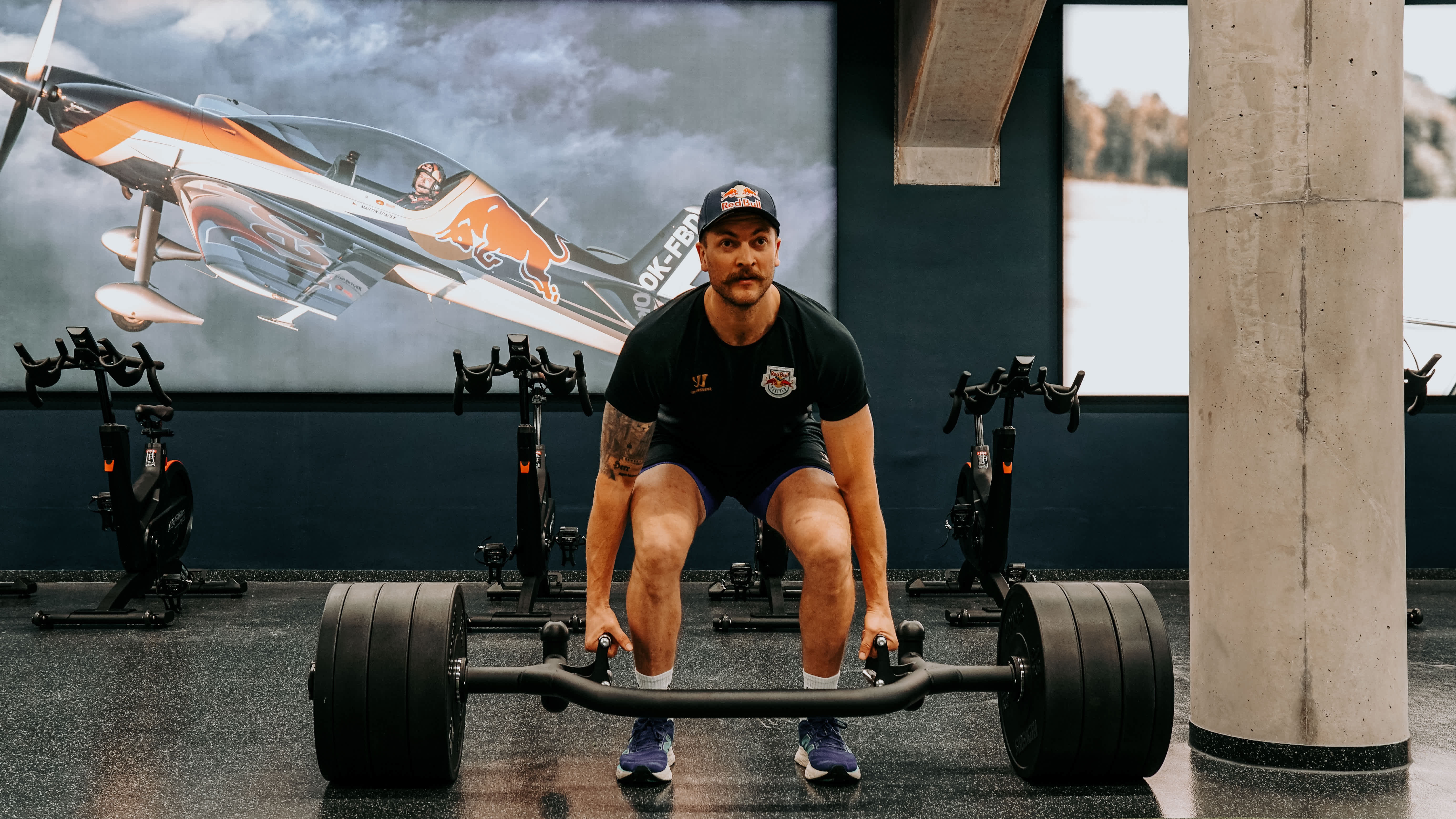 Für Konrad Abeltshauser ist Bankdrücken „natürlich immer ein Favorit“, gefolgt von Übungen wie der Pendlay Row für die Rückenmuskulatur und Ausfallschritte mit Langhantelstange im Nacken, um Beine und Rumpf zu stärken. Ein weiterer Klassiker: der Trap-Bar Deadlift.