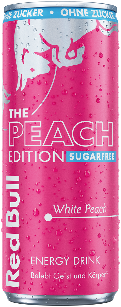 Die Red Bull Peach Edition Sugarfree mit dem Geschmack von weißem Pfirsich, abgerundet mit einem Hauch von Zitrusschale und blumigen Noten.