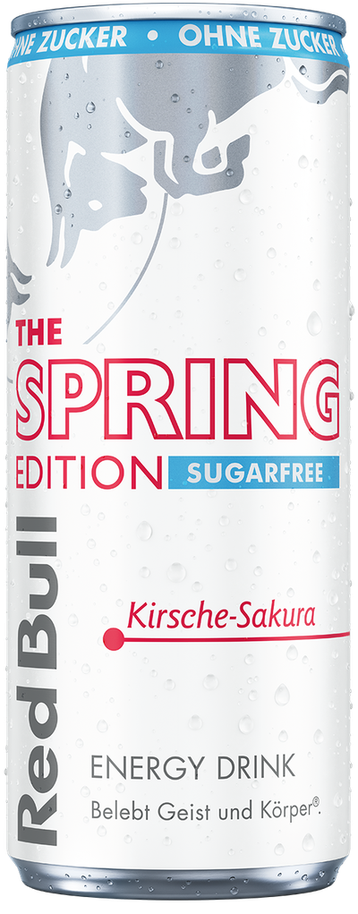 Die Red Bull Spring Edition Sugarfree mit dem Geschmack von Kirsche mit Noten von Mandel und floraler Kirschblüte.