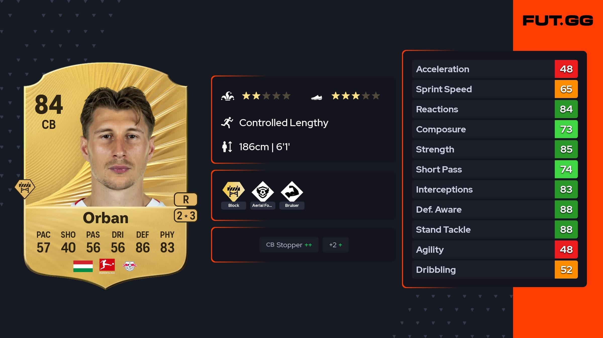 Willi Orbán nutzt in FC 26 spezielle Playstyles wie Block, Bruiser und Aerial Fortress. Diese Fähigkeiten unterstützen sein Spiel in der Luft und am Boden effektiv. Er fängt Flanken ab und verhindert Abschlüsse durch konsequentes Zustellen der Räume.