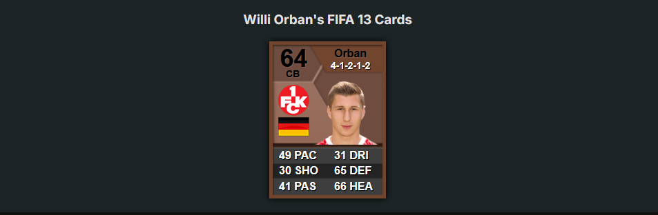 Die virtuelle Reise von Willi Orbán startete in FIFA 13 beim 1. FC Kaiserslautern in der 2. Bundesliga. Orbán erhielt eine Bronzekarte mit einer Gesamtwertung von 64 Punkten. Mit 65 Punkten in der Defensive und 69 Stärke-Punkten besaß die Karte bereits Ansätze seiner heutigen Stärken.