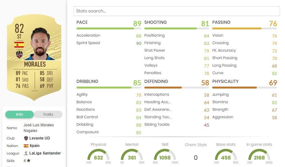 Falls ihr noch auf der Suche nach einem günstigen Stürmer aus La Liga seid, möchten wir euch Morales von UD Levante ans Herz legen. Der Spanier kostet euch nicht einmal 2.000 Münzen, ist aber eine absolute Waffe. Gründe dafür sind seine Geschwindigkeit (89), seine Dribblings (85) und sein starker Schusswert (81). Außerdem ist zu erwähnen, dass er ein Vier-Sterne-Skiller ist und Vier Sterne auf seinem schwachen Fuß hat. Mit Morales könnt ihr nichts falsch machen.