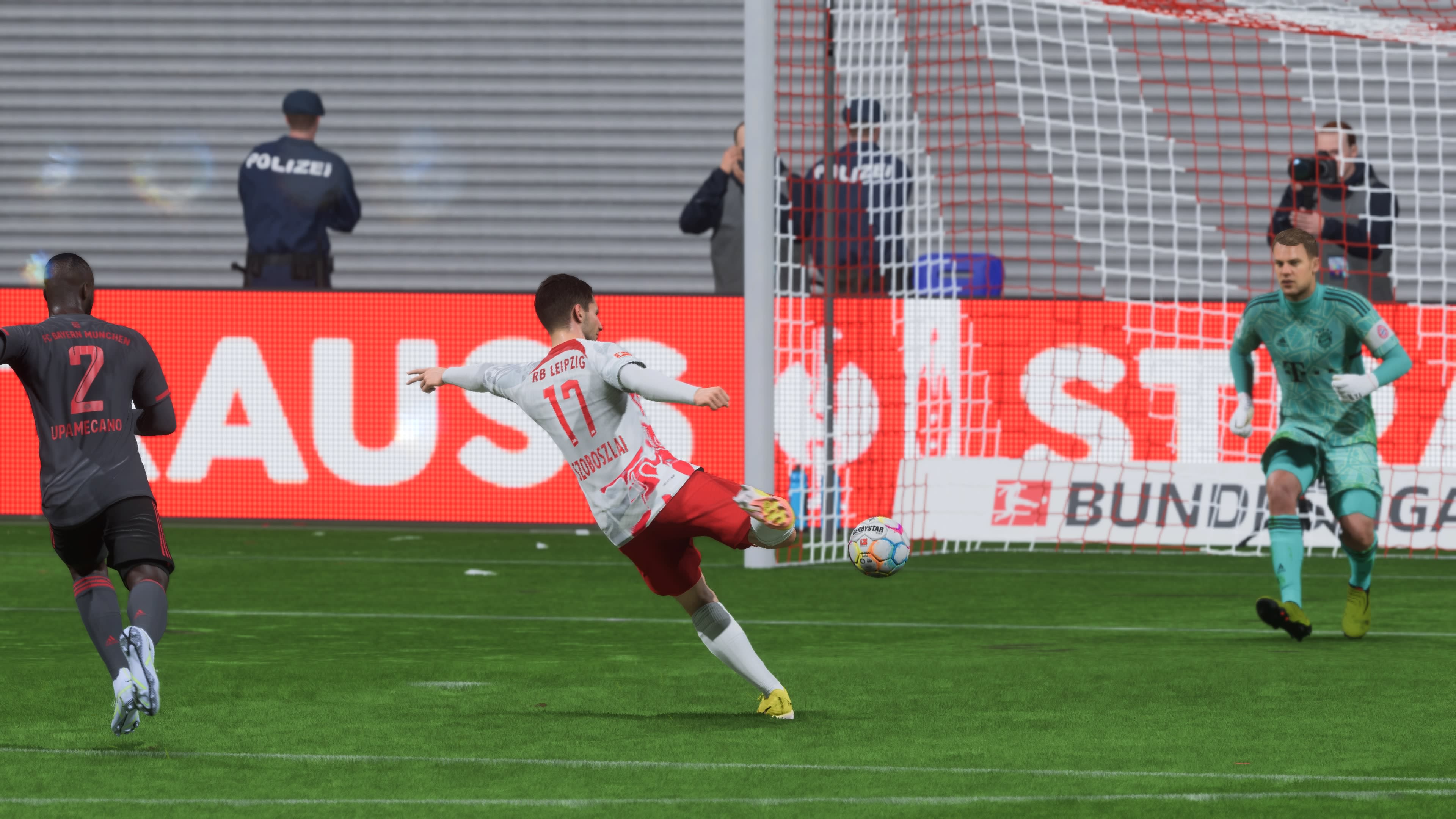 Das ermöglicht das Wechseln von Spielern in die hintere Reihe, ohne den rechten Stick mehrfach zu bewegen. Ein großer Vorteil davon ist außerdem, dass bei kurzen Wechseln der Wechsel definitiv zum nächsten Spieler vorgenommen wird und damit weniger Wechselfehler passieren. In FIFA 22 war es häufig noch so, dass beim Spielerwechseln mit dem rechten Stick ein anderer Spieler angewählt wurde, als wir eigentlich wollten. Das war dann hin und wieder auch ein Spieler, der mit der aktuellen Situation rund um den Ball gar nichts zu tun hatte. Dieses Problem gehört jetzt hoffentlich der Vergangenheit an.