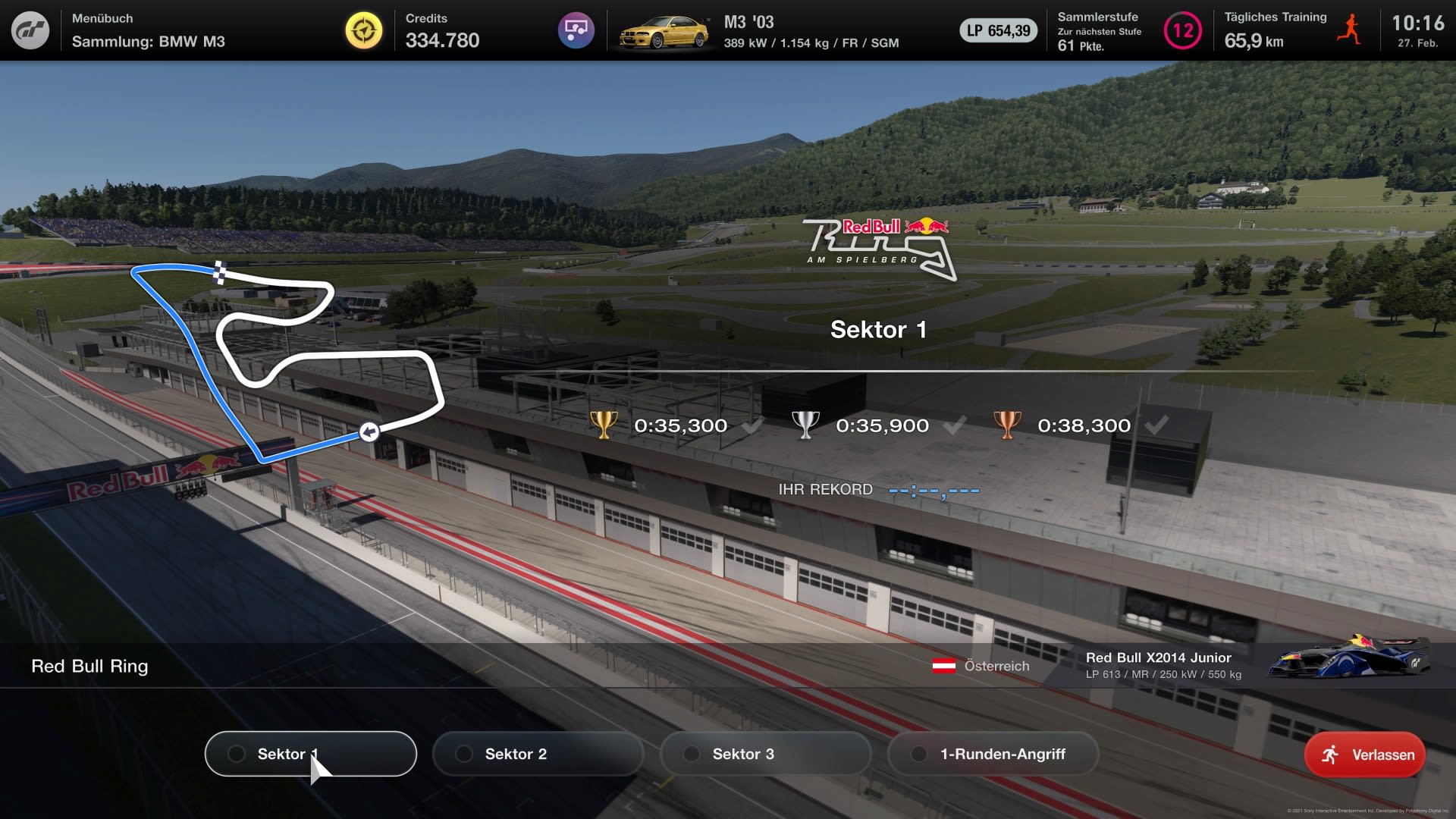 Hier könnt ihr wahlweise die einzelnen Sektoren eines Kurses erlernen oder zu einem Zeitrennen auf der gesamten Strecke (1-Runden-Angriff) antreten. Das jeweilige Auto wird euch dabei vom Spiel leihweise zur Verfügung gestellt. Dieser Modus eignet sich, wenn ihr mit einer bestimmten Kurve oder Kurvenkombination einfach nicht zurechtkommt.