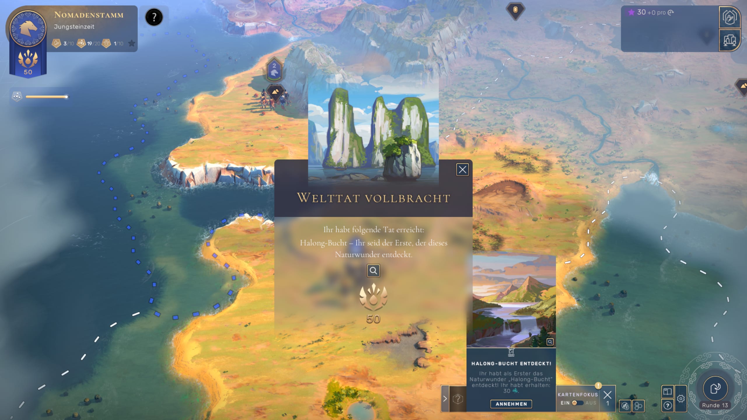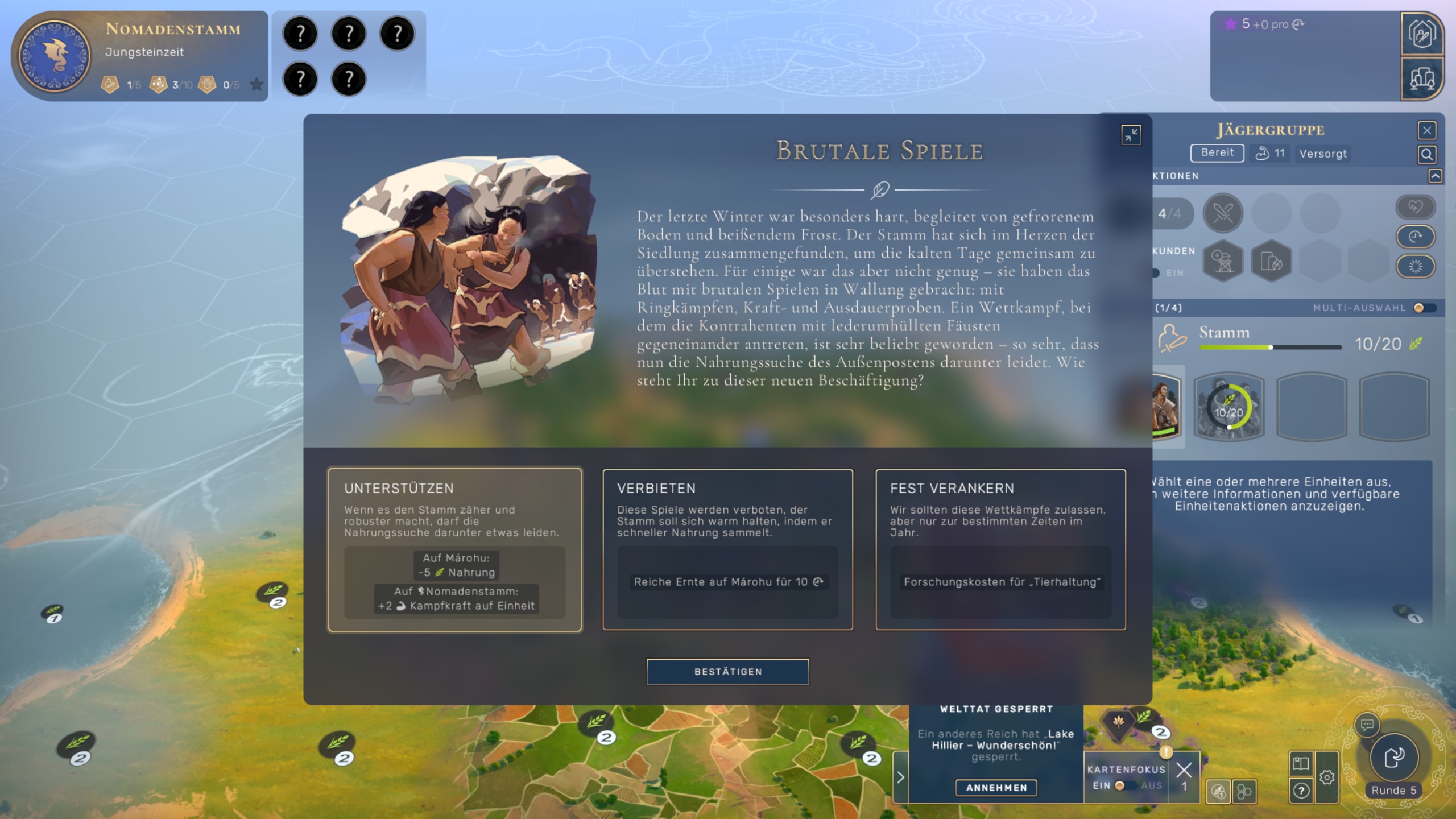 Bei fast jedem Zug muss der Spieler wichtige Entscheidungen treffen, die das Wohl und Wehe seines Volkes betreffen. Dabei geht es manchmal um Meta-Entscheidungen (siehe Wahl der Kultur), viel öfter jedoch um Mikro-Management. Soll ein Damm gebaut werden, um die Menschen zu schützen, soll eine Höhle erkundet werden, welche Religion soll sich im Land verbreiten, wie liberal wird mit An-dersdenken umgegangen, retten wir herumstreunende Gruppen oder vertreiben wir sie? Die Konsequenzen dieser Entschlüsse trägt die Bevölkerung, aber sie treiben auch die Entwicklung des Volkes mit kleinen oder großen Schritten voran und belohnen den Spieler am Ende mit Einflusspunkten, die wir wiederum in die Weiterent-wicklung der Infrastruktur usw. investieren. Ein cleverer Kreislauf, der den Spielablauf über längere Zeit frisch hält.