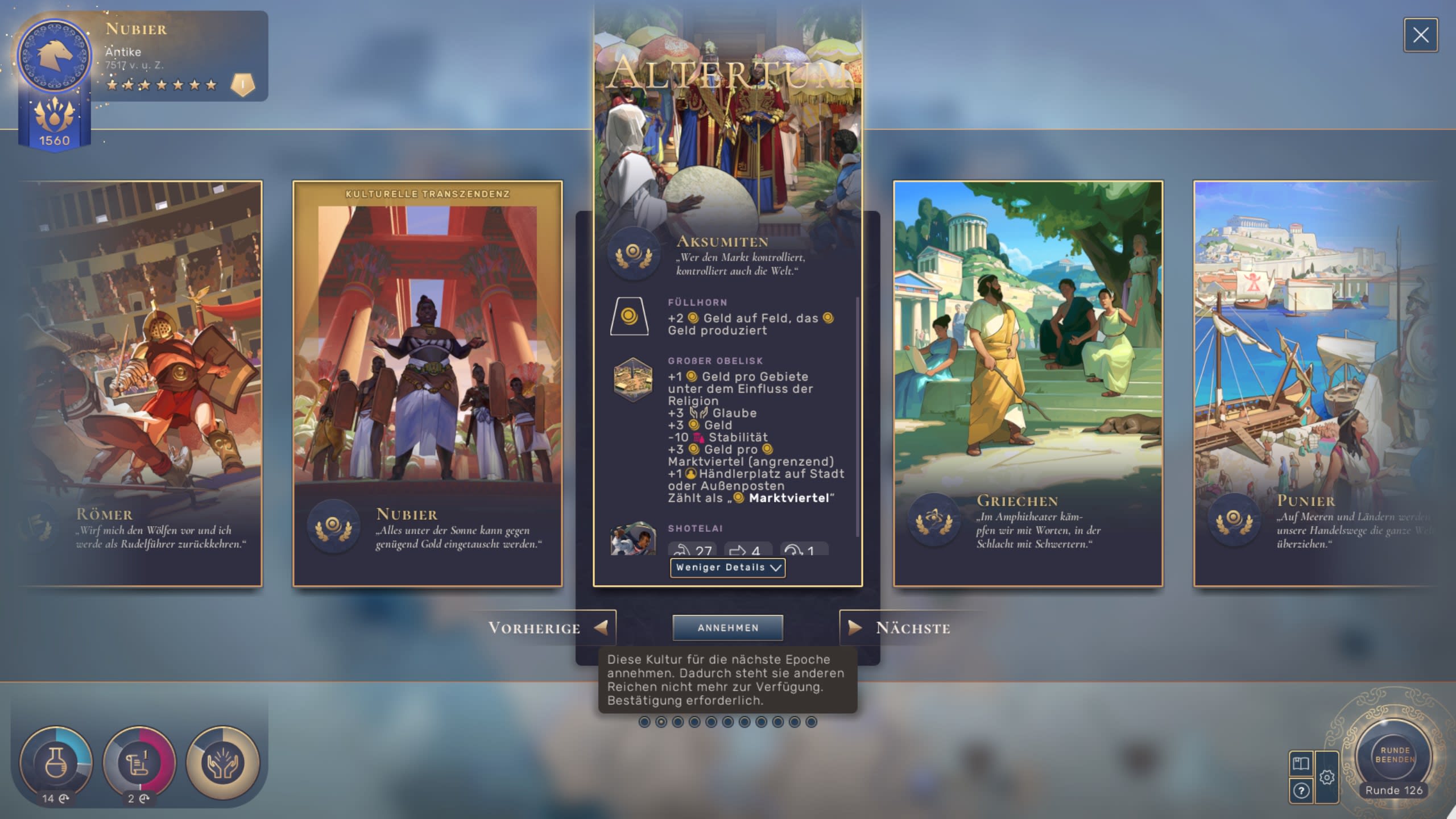 Anders als bei ähnlichen Spielen, ist man bei Humankind nicht über die gesamte Spieldauer auf eine Zivilisation beschränkt. Zunächst startet jeder Spieler mit einem Nomadenstamm, der sich langsam weiterentwickelt, während man die Welt erkundet. Nach jedem Epochen-Aufstieg gibt es die Möglichkeit, sein Reich in eine andere Richtung entwickeln zu lassen. Wer sich etwa anfangs für Nubier entscheidet, kann beim Epochenwechsel später auch auf Römer umschwenken, um ihre Boni und Fertigkeiten zu erhalten. Diese Wahl ist immer ein fundamentaler Schritt in jeder Partie, die für Erfolg und Niederlage von großer Bedeutung ist und die Humankind so einzigartig machen.
