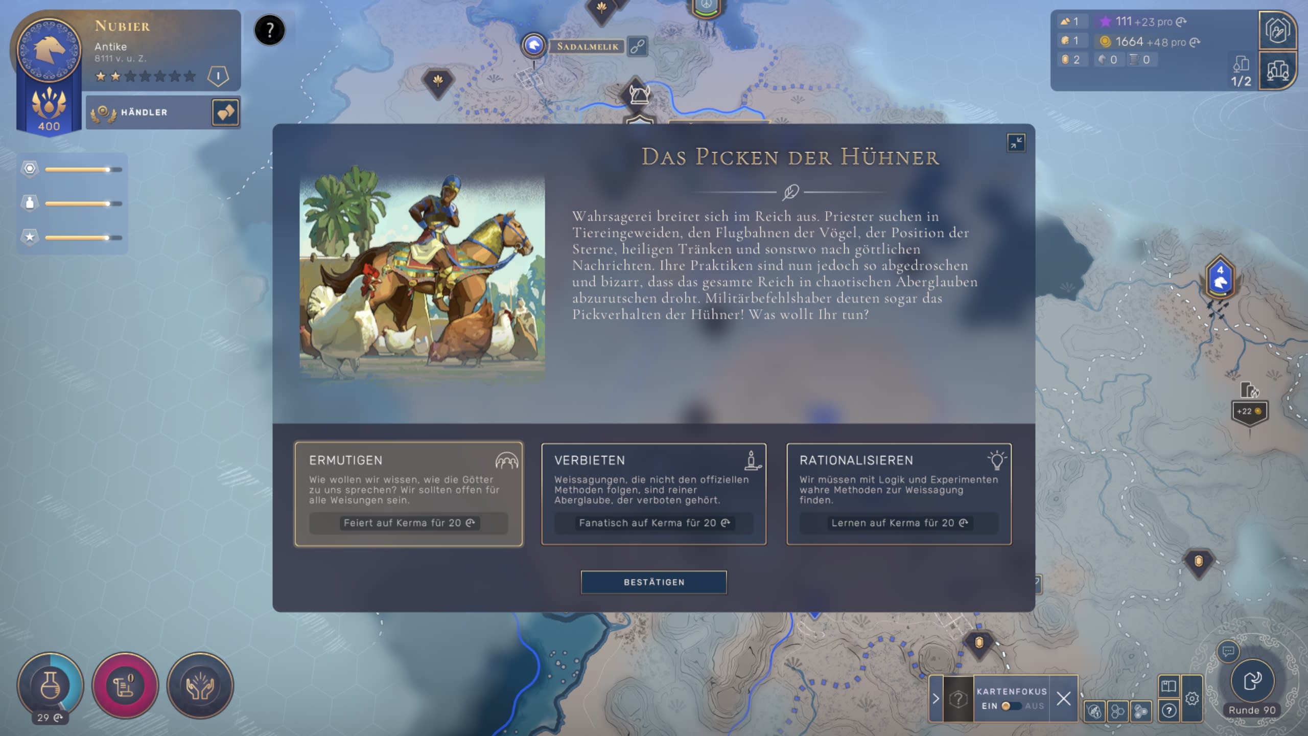 Das große Plus der wirtschaftlichen Seite ist, dass man tatsächlich nur zwei Währungen im Blick behalten muss: Gold und Einfluss. Mit Ersterem bezahlt man etwa Einheiten oder den Aufbau neuer Infrastruktur. Mit Einfluss treibt ihr dagegen den Ausbau des eigenen Reiches voran - sei es bei der Erforschung von Technologien, dem Bau neuer Städte oder dem gesellschaftlichen Ausbau. Dieses simple aber sehr effiziente System ist auch für Genre-Einsteiger absolut verständlich, ohne dass es dem Spiel dadurch an Mikro-Management mangeln würde.