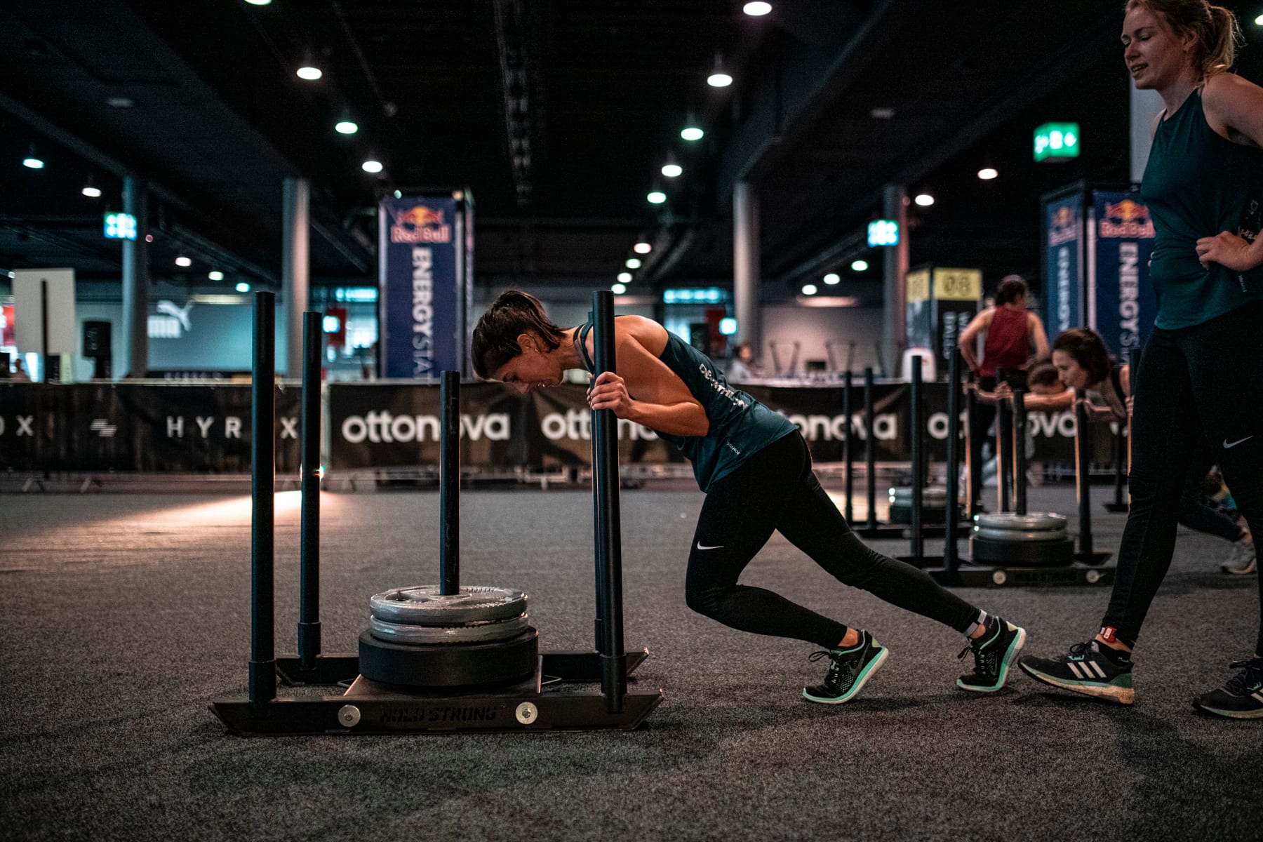 Nach dieser ersten Challenge folgt der zweite 1km-Lauf. Ohne lange Pause geht es zum Sled Push. Sled Push wird umgangssprachlich auch als Schlittenschub bezeichnet. Hierbei wird eine Maschine mit Gewichten 50 Meter nach vorne gedrückt. Es folgt der dritte 1km-Lauf mit anschließendem Sled Pull. Nach dem Drücken der Schlittenmaschine zieht man diese wieder 50 Meter zurück. Mit dem darauffolgenden 1km-Lauf wird die Halbzeit der Challenge eingeläutet und nach den 80 Metern Burpee Broad Jumps ist die Hälfte geschafft.