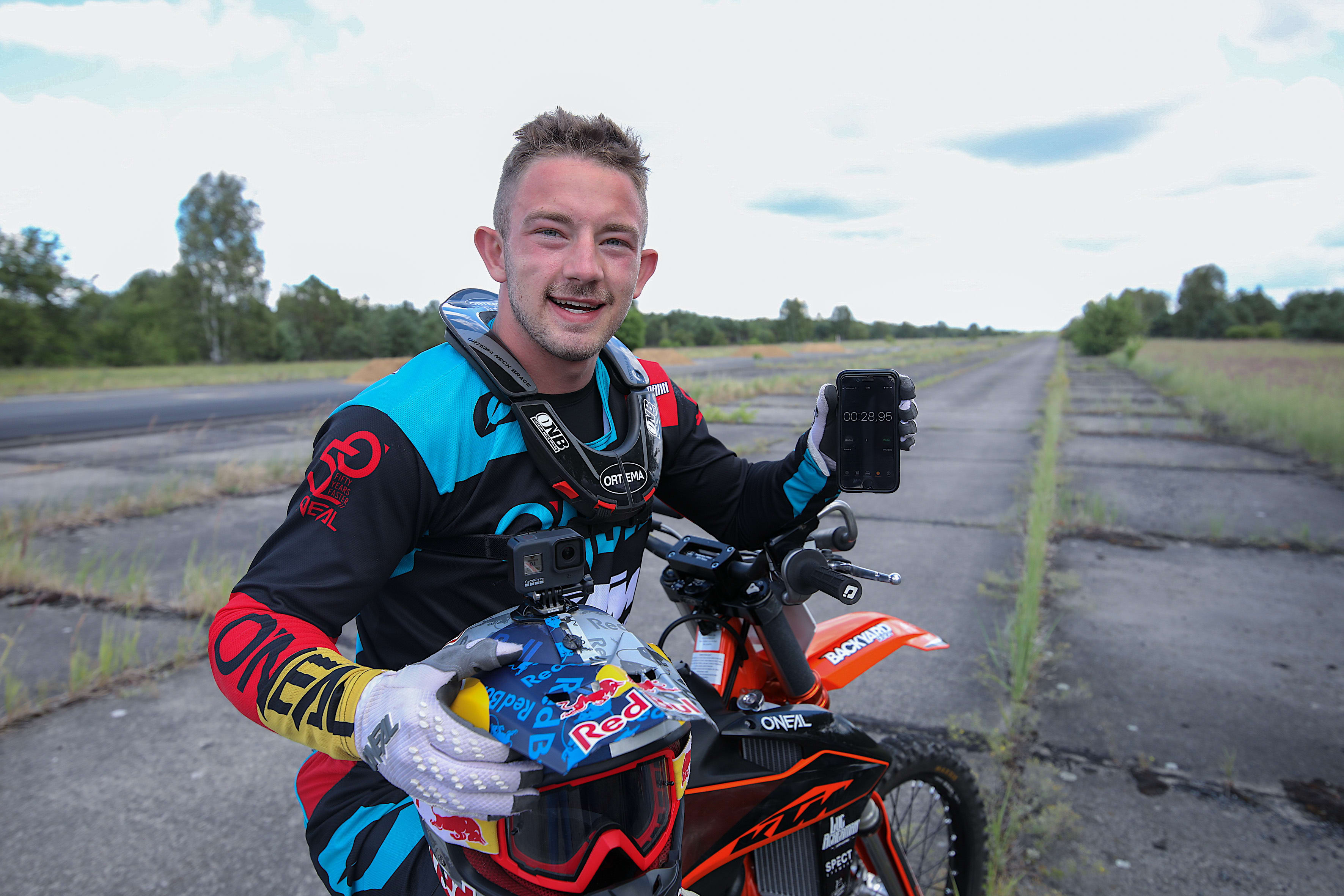 Neun Backflips in 30 Sekunden hätten für den Weltrekord gereicht, doch der Thüringer FMX-Sportler wollte mehr. Sein Ziel: zehn Rückwärts-Salti in 30 Sekunden! Beim Absprung auf dem ersten Dirt-Takeoff begann die Uhr zu zählen. Einen Backflip nach dem anderen meisterte der amtierende FIM-Weltmeister. Nachdem er den 10. Miniflip gelandet hatte, stoppte die Uhr bei 28,9 Sekunden! Luc Ackermann verbesserte den Rekord von Travis Pastrana um ganze zwei Salti auf 10 Flips in 28,95 Sekunden!