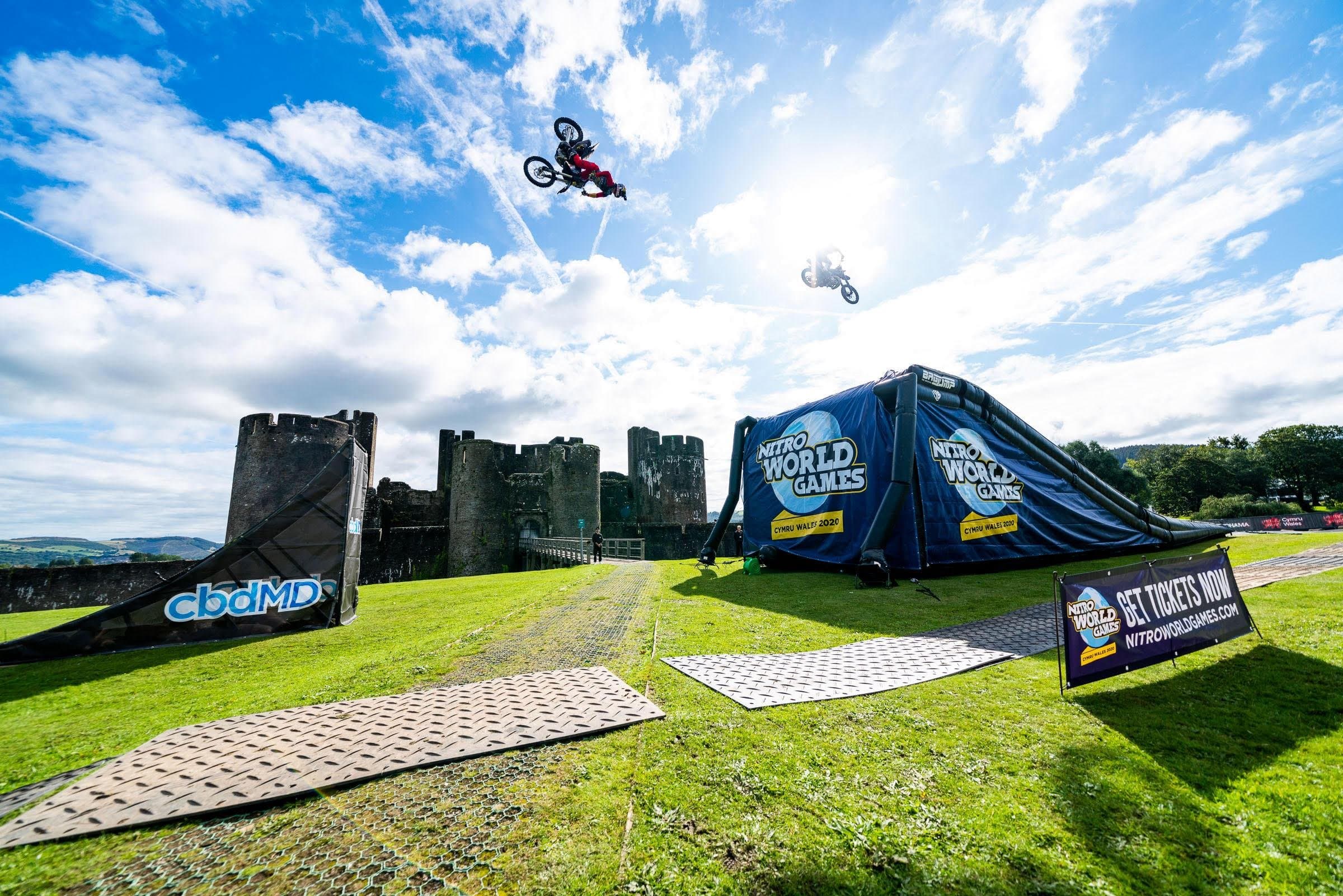 Der Stunt des Trios war der Auftakt zu den Nitro World Games, die 2020 erstmals in Wales stattfinden werden. Das historische Caerphilly Castle in Wales, die zweitgrößte Burg in Großbritannien, bildete den perfekten Hintergrund für den Weltrekordversuch. Gleich beim ersten Mal schafften der Australier Josh Sheehan, gefolgt von seinem Landsmann Jackson Strong und Luc Ackermann ihre zweifachen Rückwärtssaltos auf dem Motorrad perfekt - und befanden sich zuvor während der Tricks gleichzeitig in der Luft! Damit war der Weltrekord perfekt.