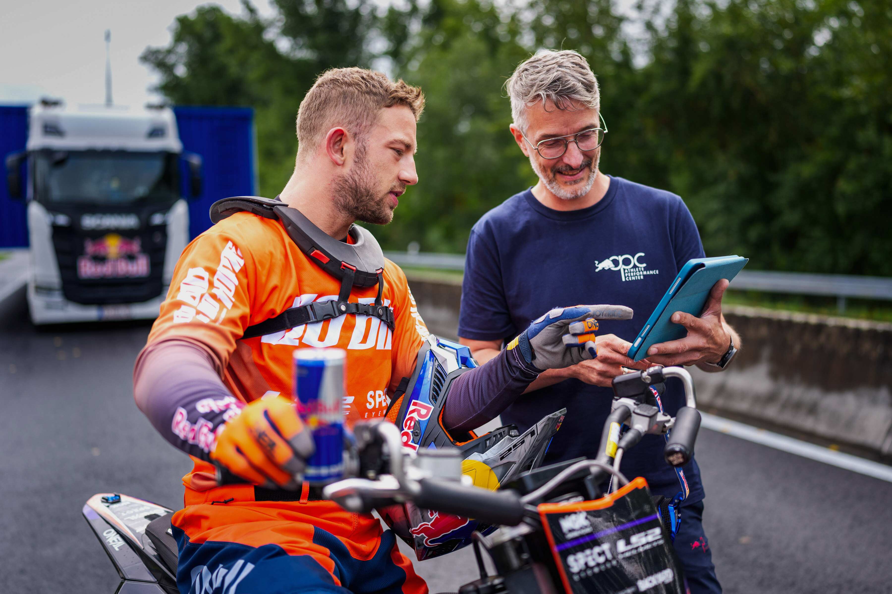 Luc Ackermann mit Tom Stoeggl, der alle wichtigen Daten visualisierte