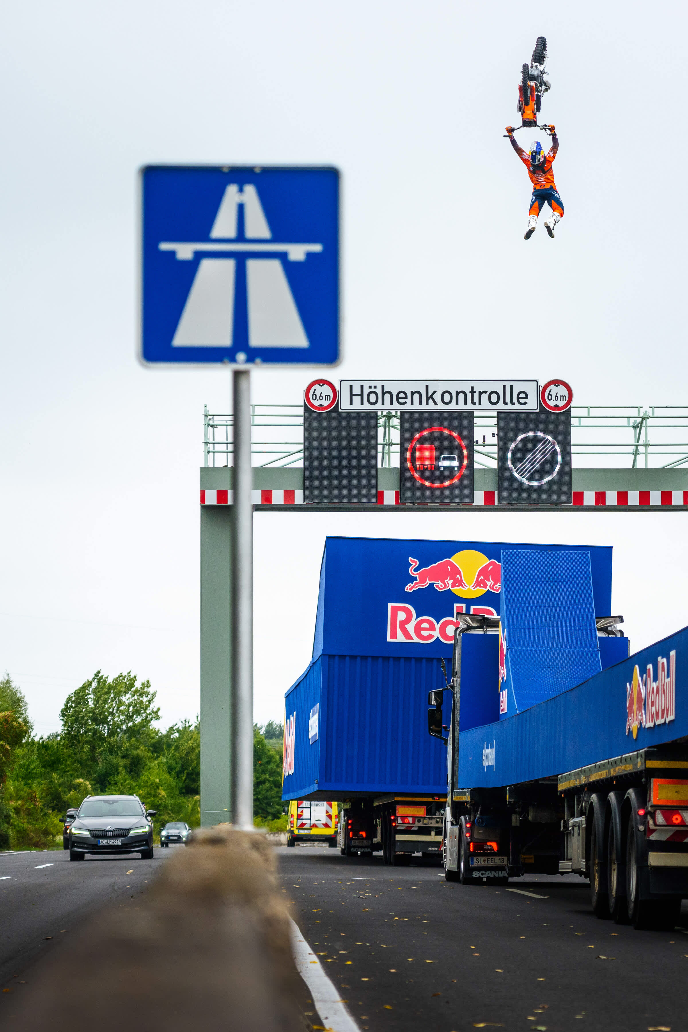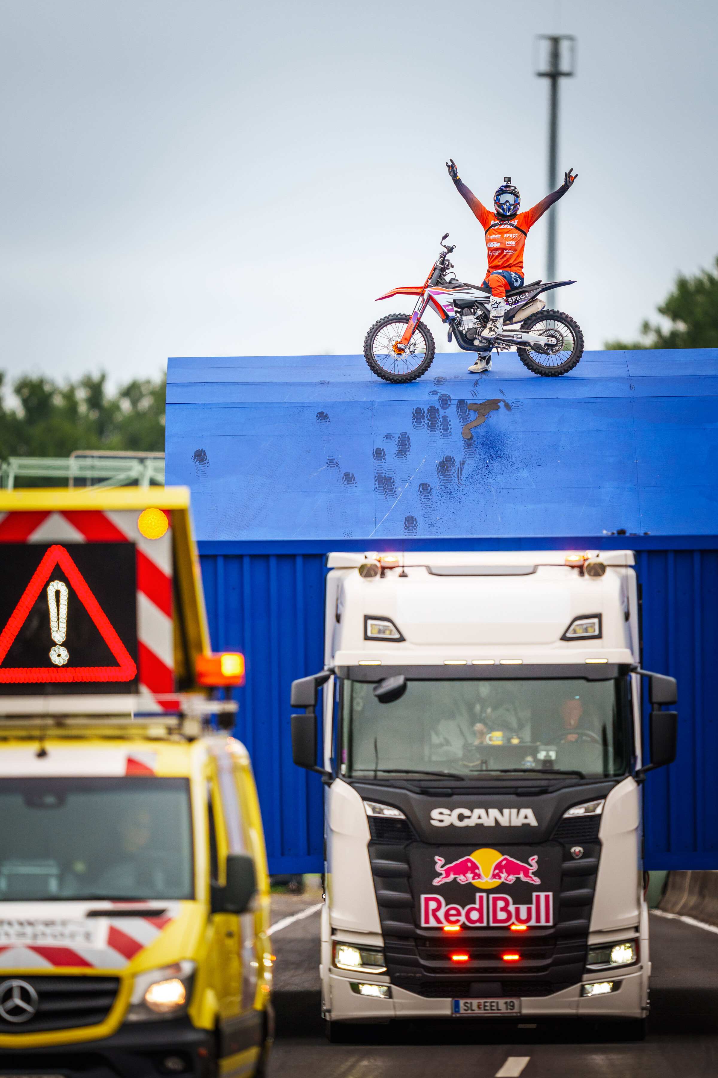 Der Plan: Luc sollte mit seinem Motorrad von einem fahrenden Truck abspringen, einen Tsunami Backflip performen, über eine Höhenkontrolle fliegen und sicher auf einem zweiten fahrenden Truck landen.