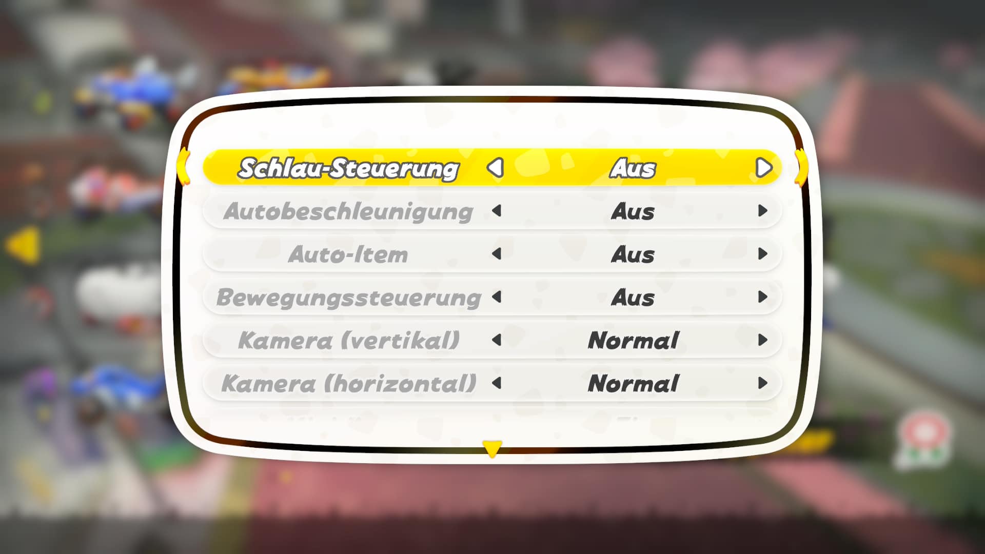 Der erste Punkt ist die "Schlau-Steuerung". Diese greift automatisch in die Lenkung ein und hilft vor allem jüngeren Spieler:innen, auf der Strecke zu bleiben. Allerdings macht es diese fast unmöglich, eine der zahlreichen Abkürzungen zu erreichen. Schalte sie also unbedingt aus, um die volle Kontrolle über dein Fahrzeug zu haben.