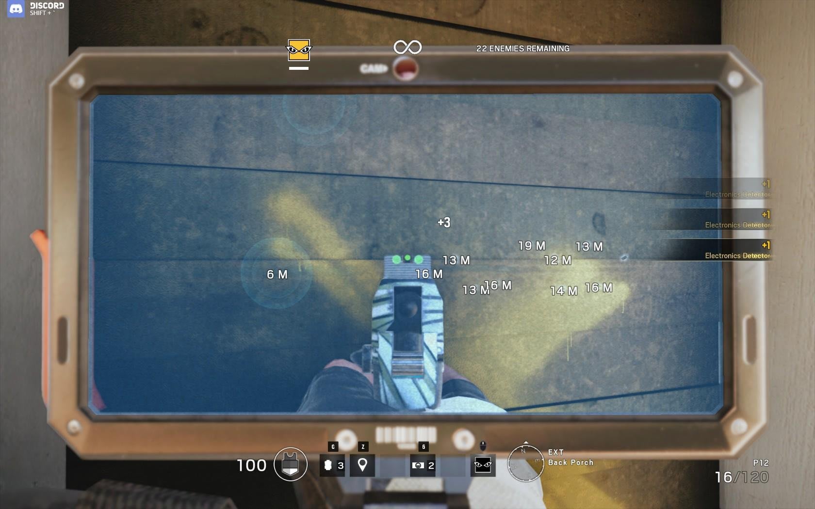 Die Reichweite eures Scanners von 15 Meter übertrifft die des Herzschlagsensors um 6 Meter, so habt ihr einen Riesenvorteil. Sobald ihr den Sensor gefunden habt, schießt ihr auf Pulse und im besten Fall holt ihr ihn aus dem Spiel. In jedem Fall aber wird er nicht so schnell wieder sein Gadget zücken. Dies erleichtert Thermite, Hibana und Maverick den Zugriff auf den Dropper.