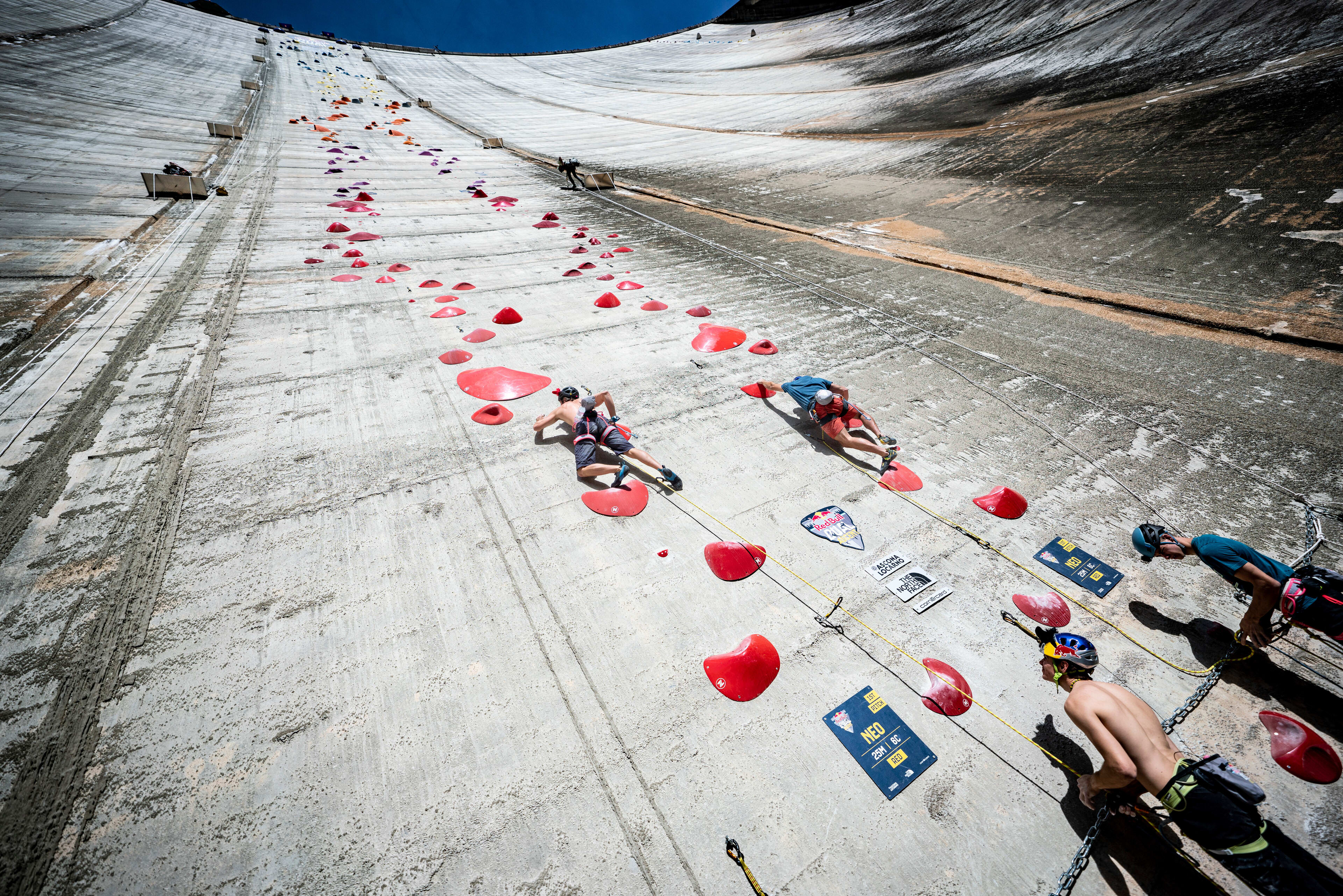 Red Bull Dual Ascent wurde 2022 zum ersten Mal abgehalten und ist genau das -- ein Outdoor-Kletterwettbewerb, der in seinem Metier Grenzen sprengt. Während die meisten Kletterhallen nur für einen Standard-Pitch von 60-70 Metern geeignet sind, geht Red Bull Dual Ascent viel höher. Genauer gesagt müssen die Teilnehmer:innen 180 Meter auf dem 220 Meter hohen Verzasca Staudamm überwinden.