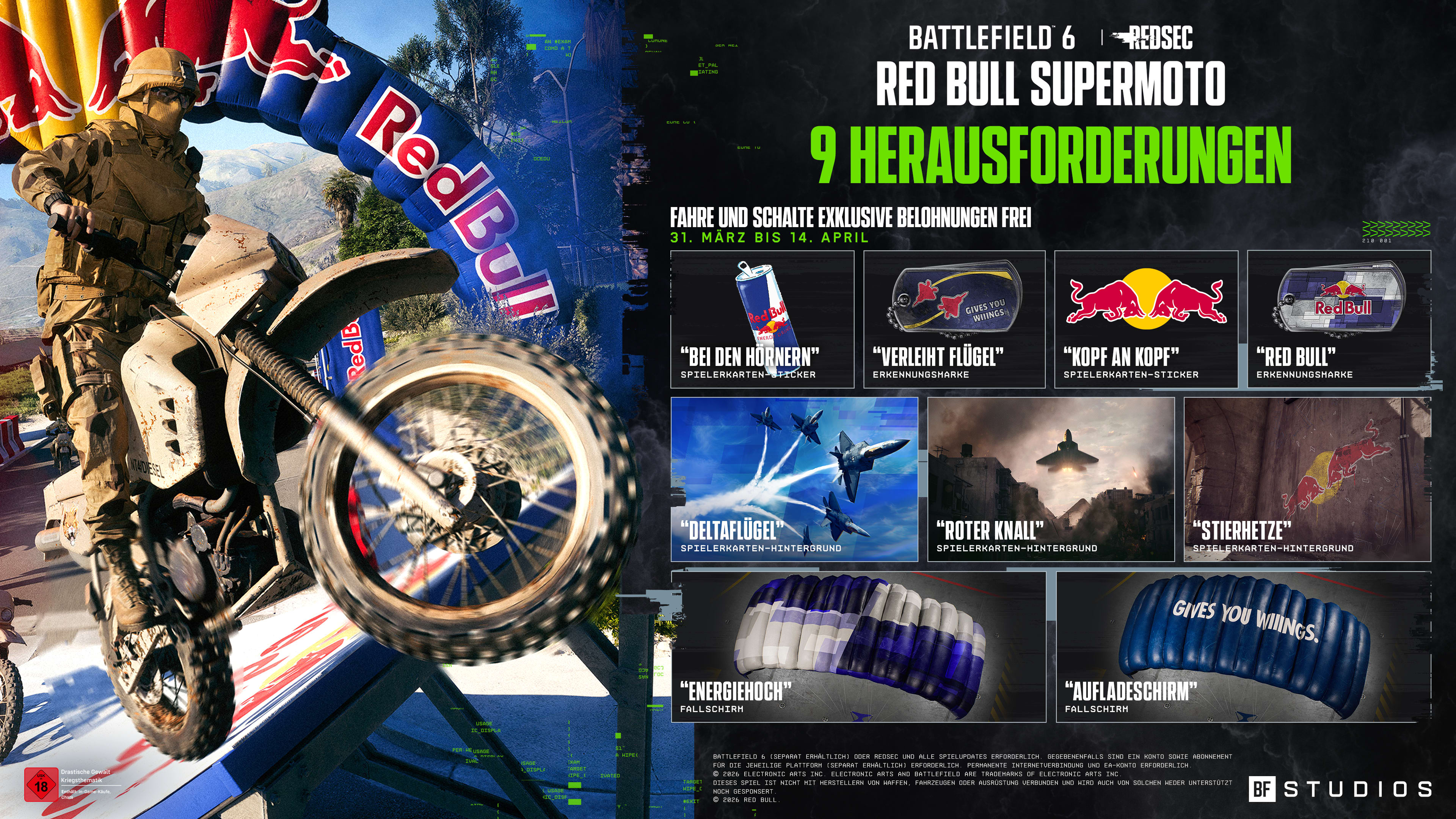 Red Bull Supermoto läuft vom 31. März bis zum 14. April 2026 und ist vollständig kostenlos zugänglich. Voraussetzung ist lediglich ein vorhandenes Exemplar von Battlefield 6 oder ein aktiver Zugang des kostenlosen Battle-Royale-Modus REDSEC inklusive aller Game Updates. Das ist passend, immerhin hat die Nightfall-Phase von Battlefield 6 Season 2 mit den Dirt Bikes eine brandneue Fahrzeug-Kategorie eingeführt, die Red Bull Supermoto jetzt in vollem Umfang zelebriert.