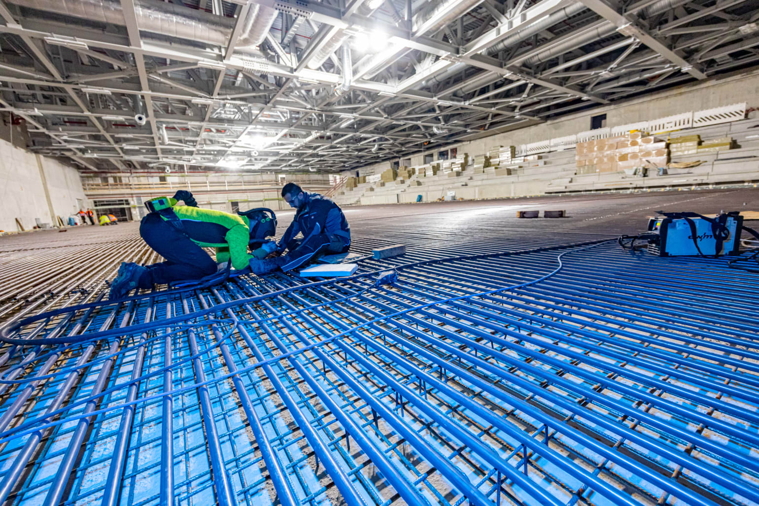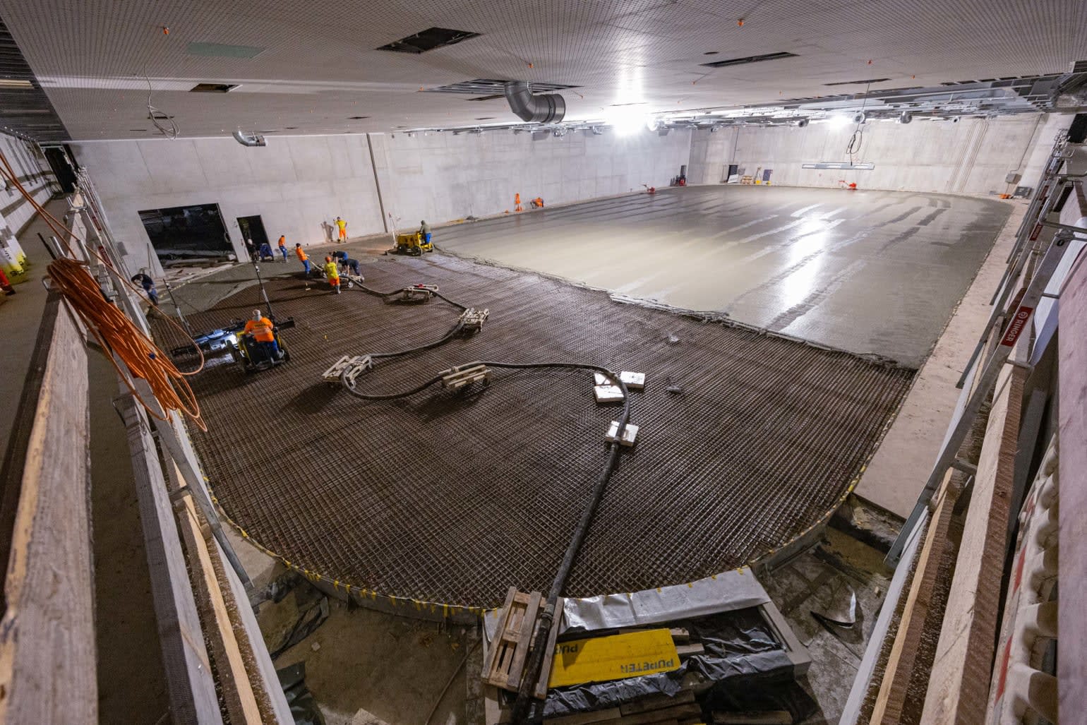 Cooling-System? Check! Betonage? Double-Check! Eine 285 m²-Schicht und eine weitere Oberschicht aus Sauberkeitsbeton (134 m²), die zu Jahresbeginn auf dem Arena Bowl sowie den zusätzlichen Eisflächen im Freizeit- sowie Breitensportereich verlegt wurden, machten den Weg für den coolsten Bau-Abschnitt im SAP Garden frei.
