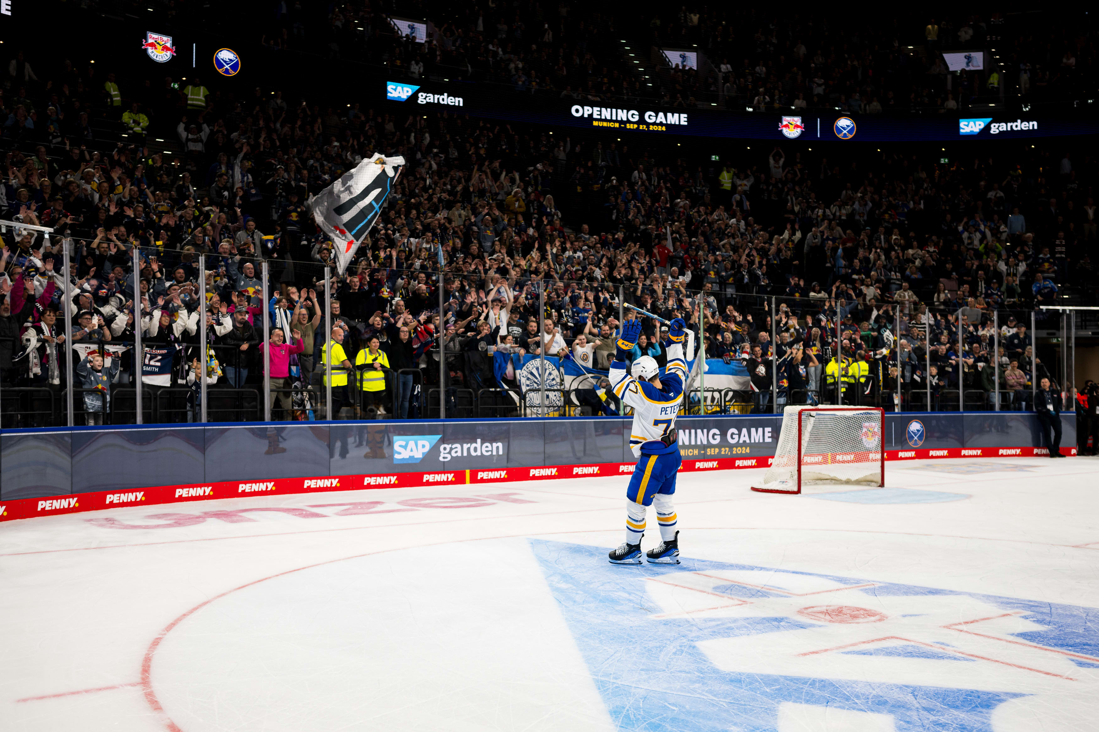 Hochgeschwindigkeits-Eishockey, Standing Ovations in den Schlussminuten und ein „Munich Boy“ mit gefühlter unlimited Time on Ice. Mit dem Treffer zum 5:0 durch John-Jason Peterka, von der Crowd wie der fehlende Ehrentreffer des EHC Red Bull München gegen die Buffalo Sabres bejubelt, sowie einer Welle ließ die Nordkurve den in der Red Bull Hockey Akademie ausgebildeten NHL-Star nicht davon kommen.