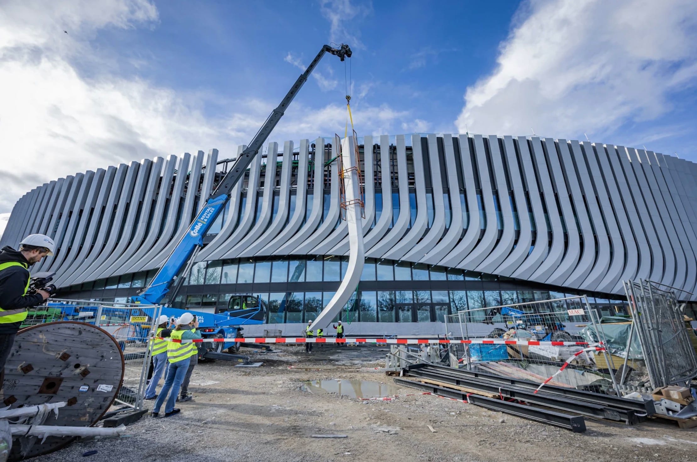 Für die Montage der 800 Kilogramm schweren Lisene mussten im Anschluss Hebebühne sowie der Baukran her. Komplett aus Aluminium bestehend und optisch wie ein Eishockey-Schläger gebogen, komplettiert die 260. Lisene die imposante Außenfassade und gibt dem SAP Garden damit sein einzigartiges Design.