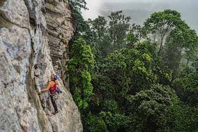 Wir wählten die Route Nubivigant (5.13d), bevor wir uns wirklich dazu entschlossen, die Leve Leve zu klettern. Letztere ist traditioneller, während die Nubivigant bereits Bohrhaken verankert hatte. Wir hatten 17 Tage hintereinander regen, was die Gefahr beim Klettern drastisch erhöhte, da unsere Ausrüstung nicht dafür gemacht war.