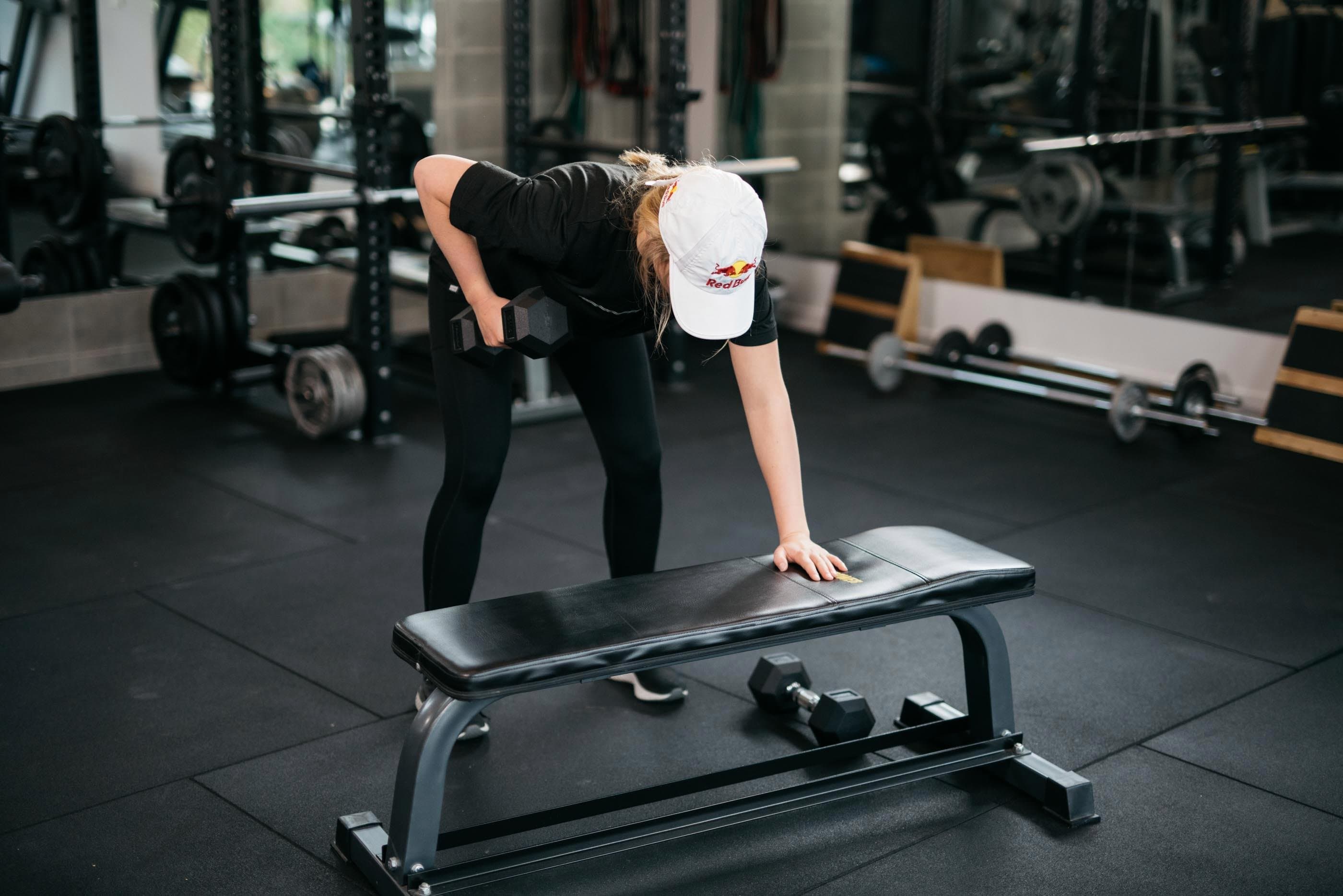 So geht's: Starte in einem etwas über schulterbreitem Stand eine Armlänge entfernt von einer Hantelbank, deine Knie sind leicht gebeugt, dein Oberkörper aufrecht. Die Kurzhanteln liegen zwischen deinen Füßen und der Hantelbank auf dem Boden. Beuge deinen Oberkörper nun so weit nach vorne, bis du in der Hüfte einen 90 Grad Winkel hast. Eine Hand stützt sich nun auf die Hantelbank, die andere greift die Kurzhantel. Ziehe die Kurzhantel von hier aus kontrolliert und langsam in Richtung Bauchnabel neben deinen Körper. Achte dabei auf einen geraden Rücken und halte deinen Oberkörper stabil. Führe die Kurzhantel anschließend langsam zurück in die Ausgangsposition. Wiederhole diese Übung 10-15 Mal. Je nach Fitnesslevel kannst du 2 bis 3 Sätze absolvieren, bevor du zur nächsten Übung übergehst.