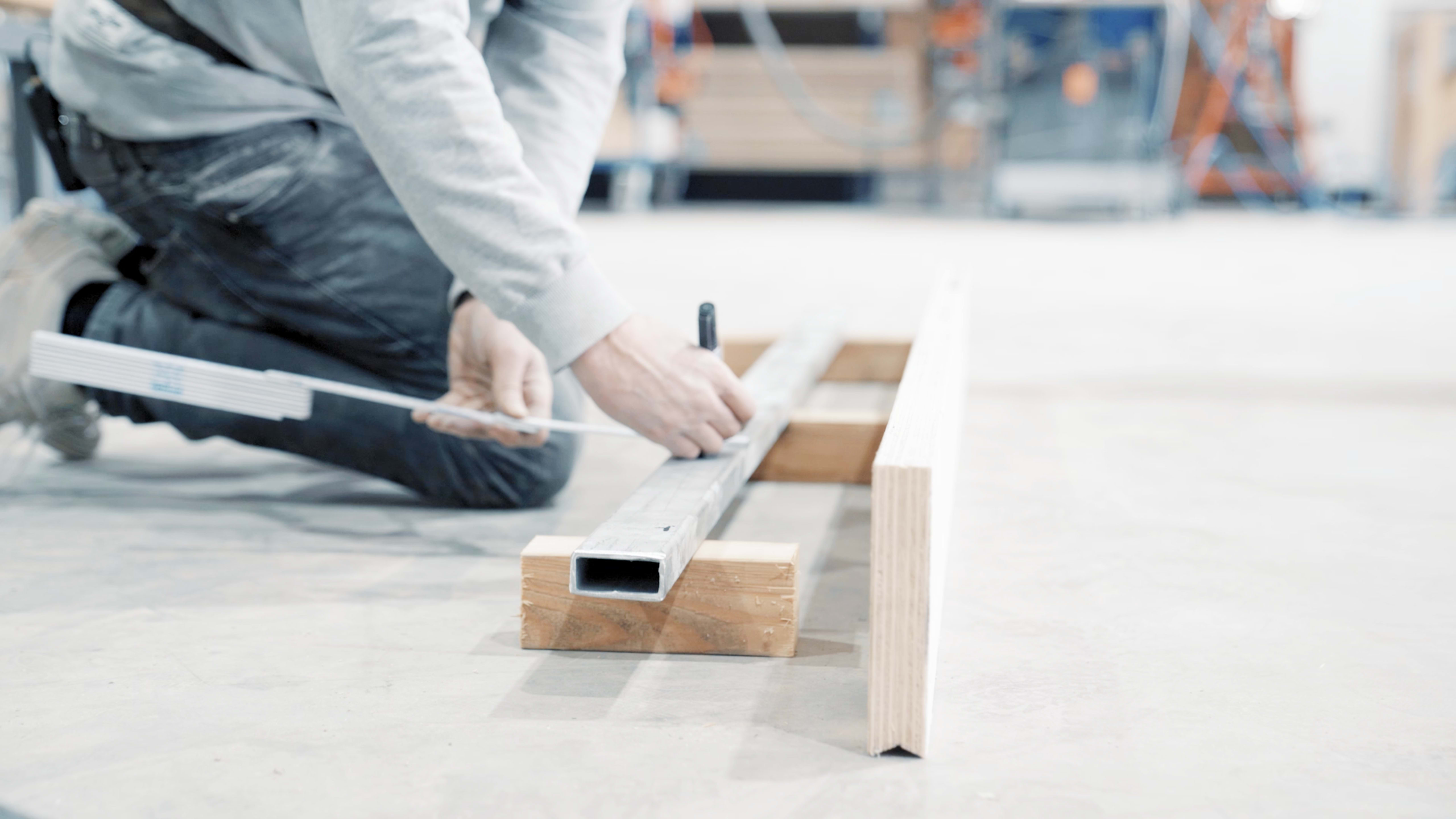 - Verschraube nun das vorbereitete Vierkantrohr mit fünf 6 x 120er Torx-Schrauben auf der flachen Seite deiner Holzleiste. Achte hierbei darauf, dass das Vierkantrohr an einer Seite bündig ist.