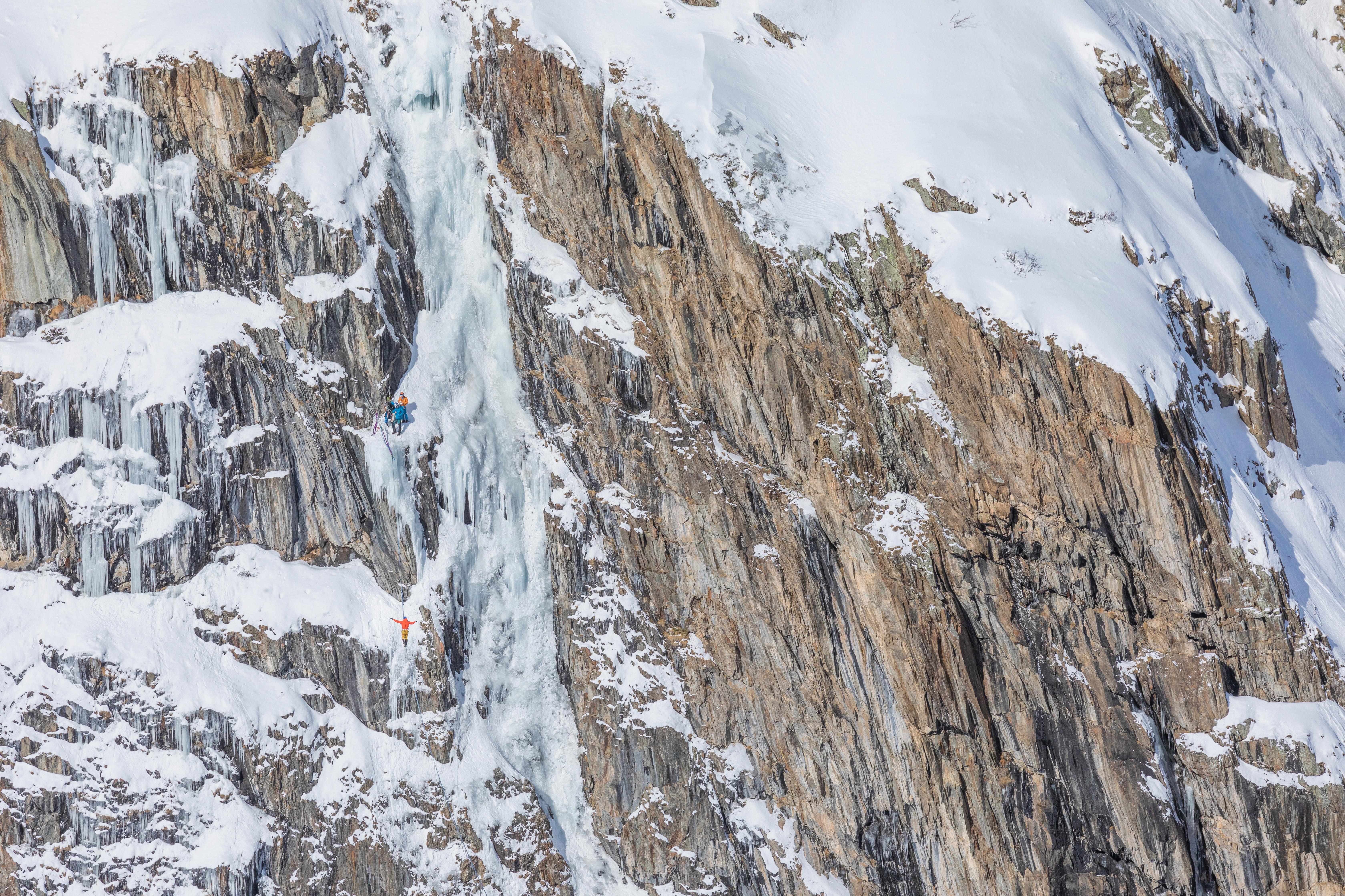 Ja, das war es auch. Wir mussten das rund 200 Kilo schwere Equipment erst einmal nach oben bringen. Dann erkletterten wir beide Wasserfälle, um zu sehen, wo wir die Fixierungen anbringen können. Die Anker wurden dann mit bis zu sechs Befestigungspunkten ins Eis gebohrt.