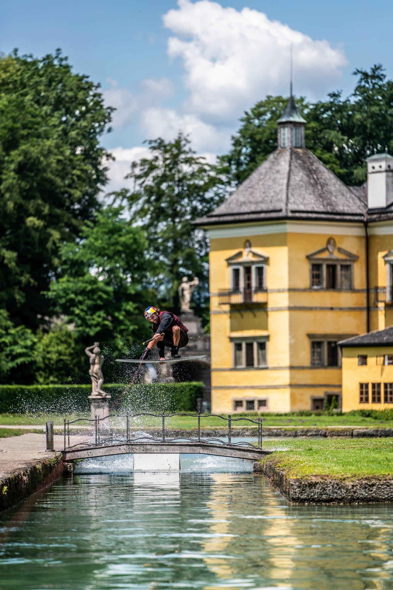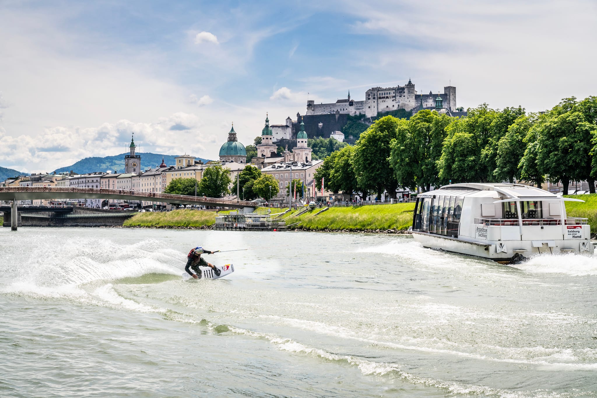Die Herausforderungen waren nicht nur die Tricks und das Timing, sondern auch das Wakeboarden an Orten, die niemand auf dem Radar hat, wenn es um Wassersport-Challenges geht. So standen natürlich die Salzburger Sightseeing-Highlights Schloss Hellbrunn und Schloss Leopoldskron auf dem Programm. Auch der Mirabellgarten durfte als Wakeboard-Playground nicht fehlen. Und ganz nebenbei war Dom Hernler der erste Sportler überhaupt, der nicht nur für eine Schiffsrundfahrt Platz genommen hat, sondern vom Panorama-Speedboot "Amadeus Salzburg" zum Wakeboarding gezogen wurde.