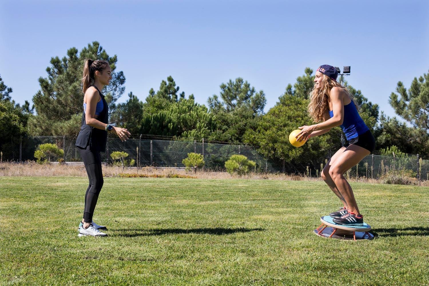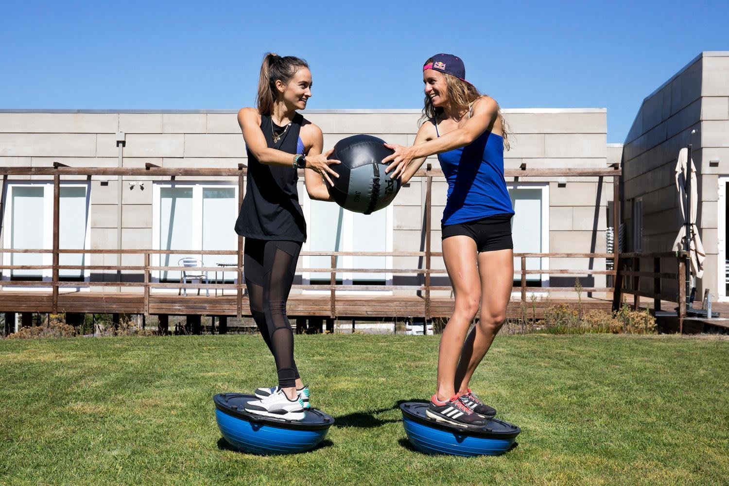 - Startposition: Stehe mit deinem Partner einen halben Meter auseinander. Beide stehen hüftbreit auf einem Bosu-Ball, die Rücken zueinander. Einer hält einen 3-5 Kilo schweren Medizinball in den Händen.