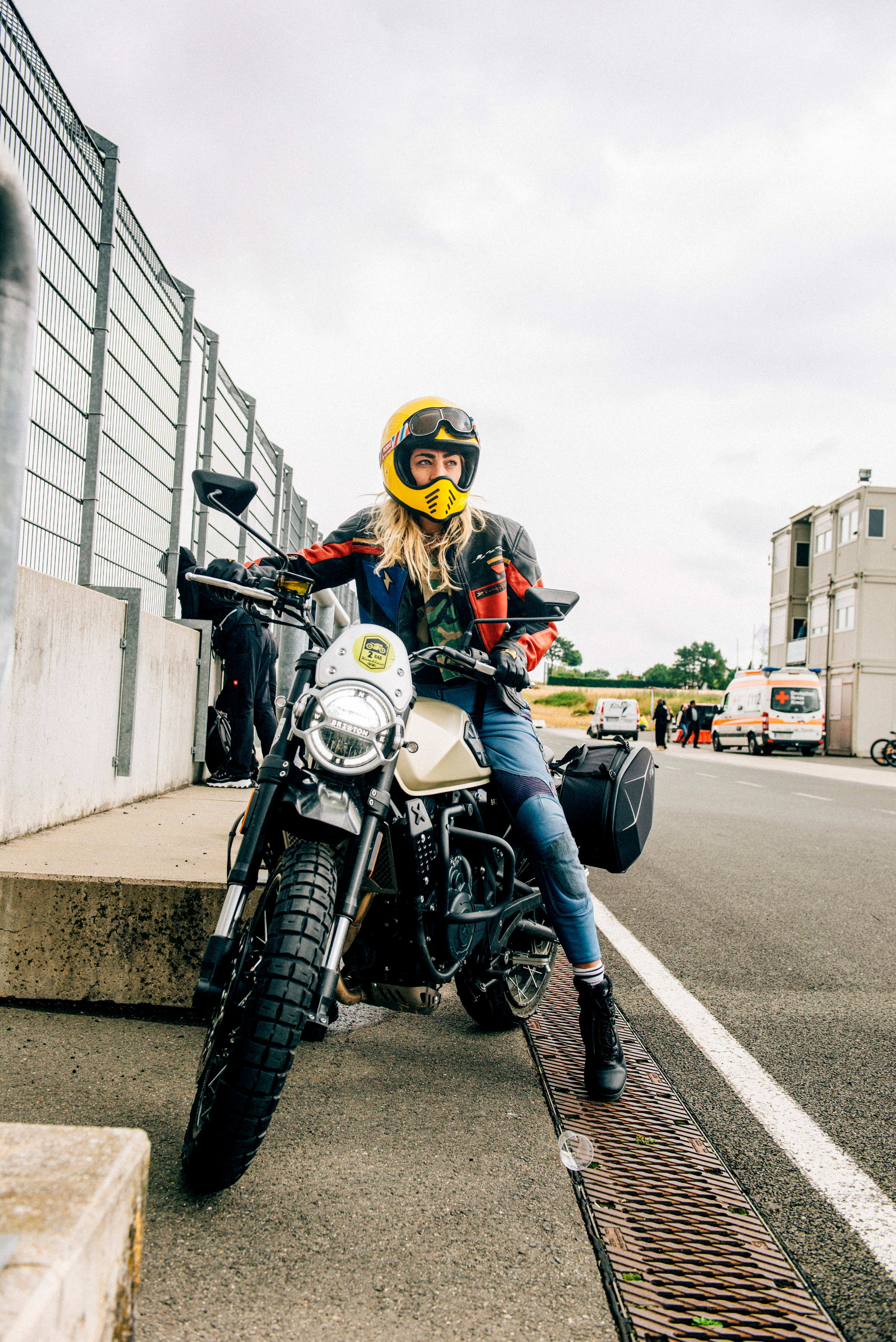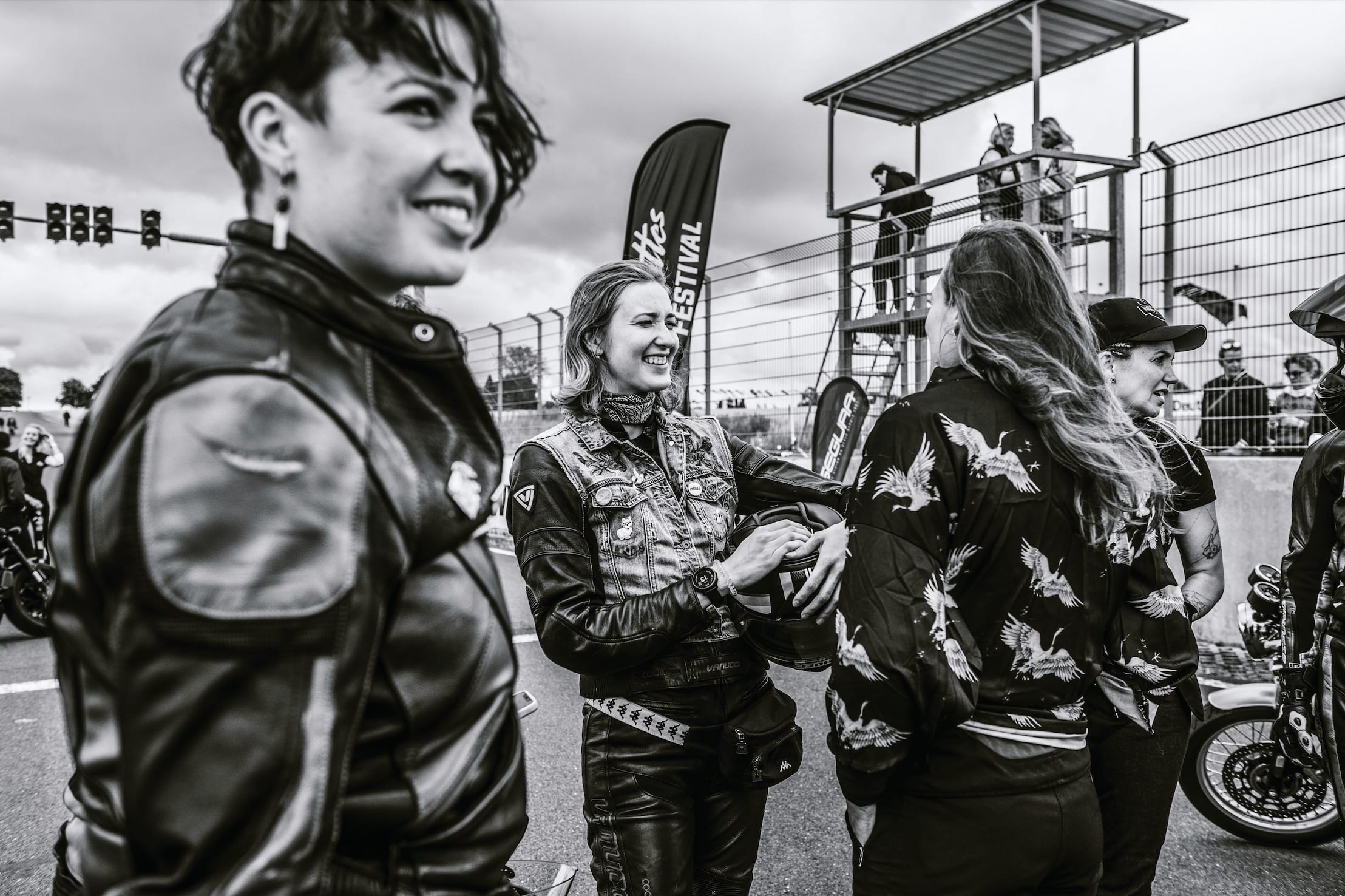 Dieses Jahr findet das Festival auf dem „Schleizer Dreieck“ statt, einem legendären Straßenkurs in Thüringen. Die Infrastruktur und die Gebäude wurden nicht an das 21. Jahrhundert angepasst, sondern haben sich ihren baufälliges Flair bewahrt: abblätternde Farbe, Maschendrahtzäune und wettergegerbte Tribünen. Unter einem schiefergrauen Himmel mischt sich zum Gesang von AC/DC-Sänger Bon Scott aus den Boxen das Dröhnen von Hunderten zuckenden Gasgriffen. Irene Kotnik ergreift das Mikro für einen letzten fiebrigen Anfeuerungsruf, die schwarz-weiß karierte Startflagge wird gehisst – und los geht’s.