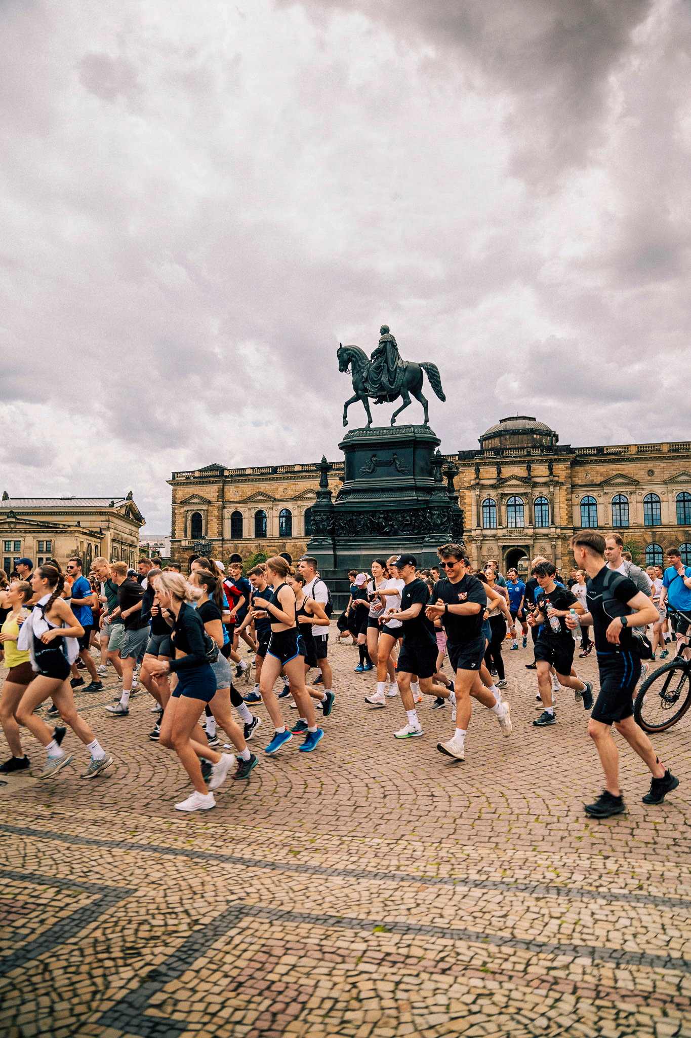 Was die Dresdner von anderen Run Clubs unterscheidet, ist der breite Ansatz als „Sports Club“: Neben Läufen haben sie auch ein Beachvolleyballturnier veranstaltet und ein Treffen im Gym. Für 2026 geplant sind ein Padel-Turnier, ein Basketball-Contest und eine Rennradausfahrt. Ziel ist nicht der Sieg, sondern die Gemeinschaft, oder wie die drei es sagen: „Eine super krass familiäre Atmosphäre.“ Darum konnten sich beim Volleyball nicht feste Teams anmelden, man wurde zufällig ausgelost – der Teamspirit kam von allein. Die Social Runs bleiben aber der Kern, gerne kreativ als Sunset Run, als Weihnachtslauf mit Nikolausmützen oder kürzlich ein Lauf am Weltfrauentag samt Blumen am Ende für jede Läuferin.
