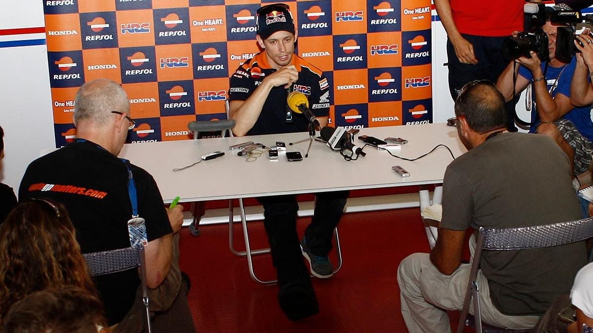 Der Australier lag 32 Punkte hinter Lorenzo, als die Championship-Runde in Indy zur elften Runde der Saison 2012 ankam. Er gab alles, um den Abstand zu verringern, um seinen Titel noch verteidigen zu können. Im Qualifying highsidete er jedoch und schlug hart auf, erlitt Knochenbrüche und -absplitterungen im rechten Knöchel und riss sich mehrere Bänder.